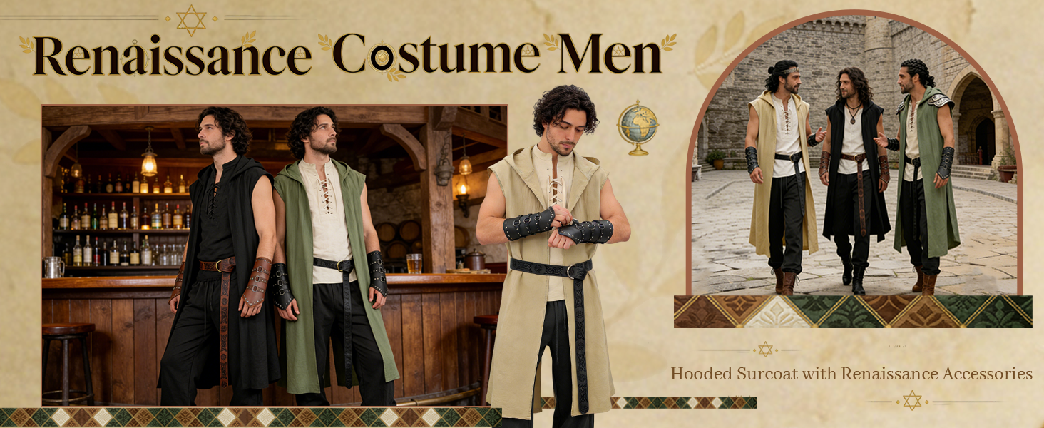 • زي عصر النهضة الكامل للرجال: تشتمل مجموعة أزياء عصر النهضة الرجالية المكونة من 3 قطع على معطف بغطاء للرأس وحزام جلدي ودعامات - مثالية لأي شخص يبحث عن زي رجالي كامل من العصور الوسطى/عصر النهضة للمعارض أو الحفلات التنكرية أو الهالوين.