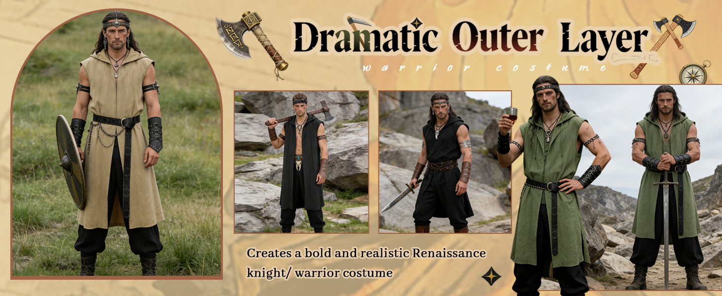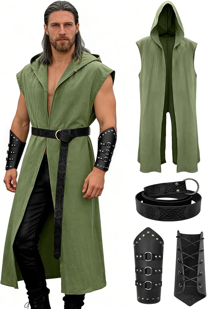 • معطف بغطاء للرأس أصلي من العصور الوسطى: معطف بغطاء للرأس متدفق يضفي لمسة كلاسيكية من العصور الوسطى على مظهرك، ويتوافق بشكل مثالي مع القمصان أو الدروع كبديل لسترة عصر النهضة. مثالي كزي فارس عصر النهضة أو زي المحارب.