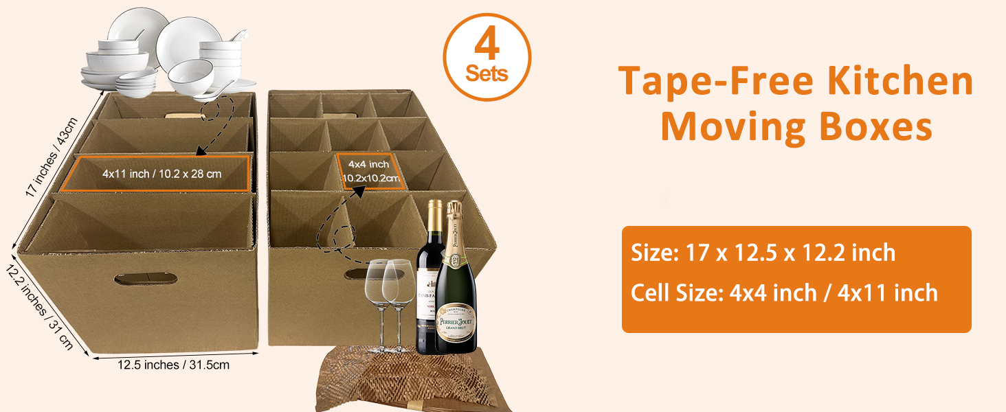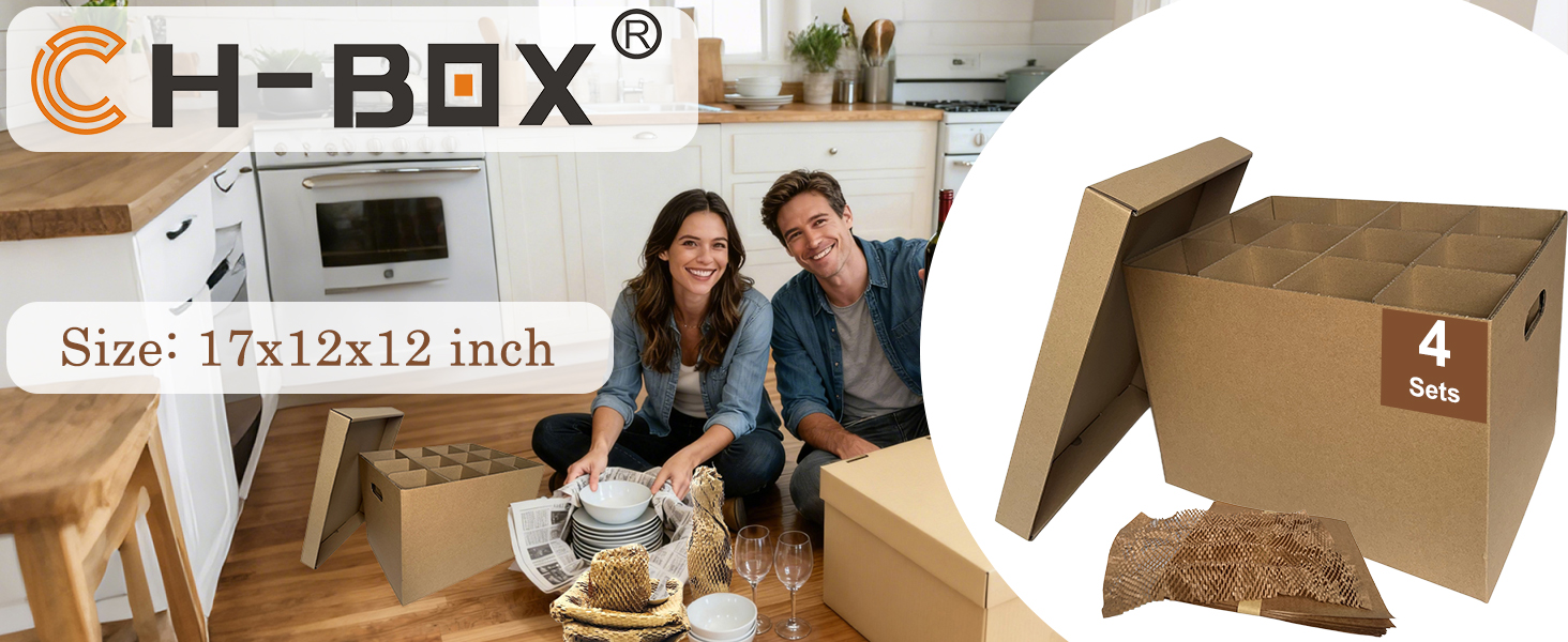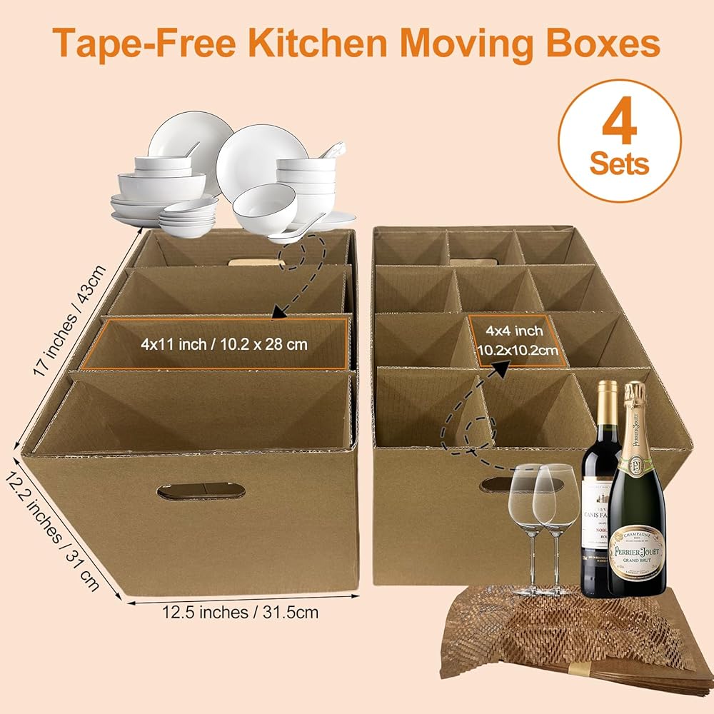 صناديق المطبخ المتحركة مع مجموعات مقسمة لتغليف أطباق النبيذ الزجاجية وأغطية الوسائد، 4 عبوات مقاس 17 × 12 × 12 بوصة، مقابض معززة، خالية من الأشرطة (CK171212)