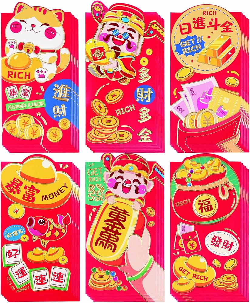مظاريف حمراء للعام الصيني الجديد، مظاريف حمراء للعام القمري الجديد، جيوب أموال محظوظة من Hongbao للنقود 红包 Lai See (6 أنماط 36 قطعة)