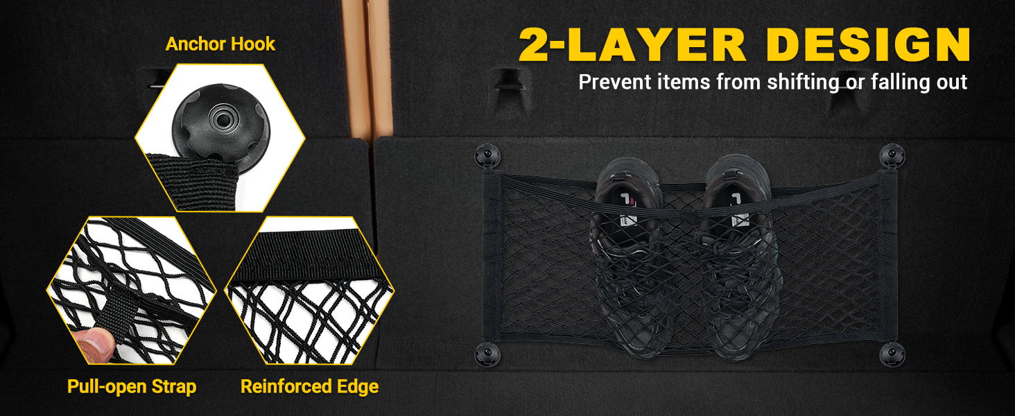 • شبكة كارجو متعددة الاستخدامات - لا تدع الأشياء السائبة تستولي على سيارتك أو جراجك أو مركبتك الترفيهية. يتم تركيب هذه الشبكة بسهولة على الجدران، والخزائن، وظهر المقاعد للحفاظ على الأساسيات آمنة وفي متناول اليد