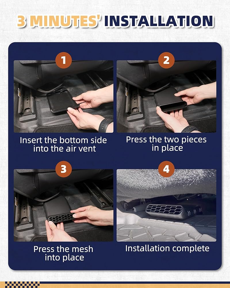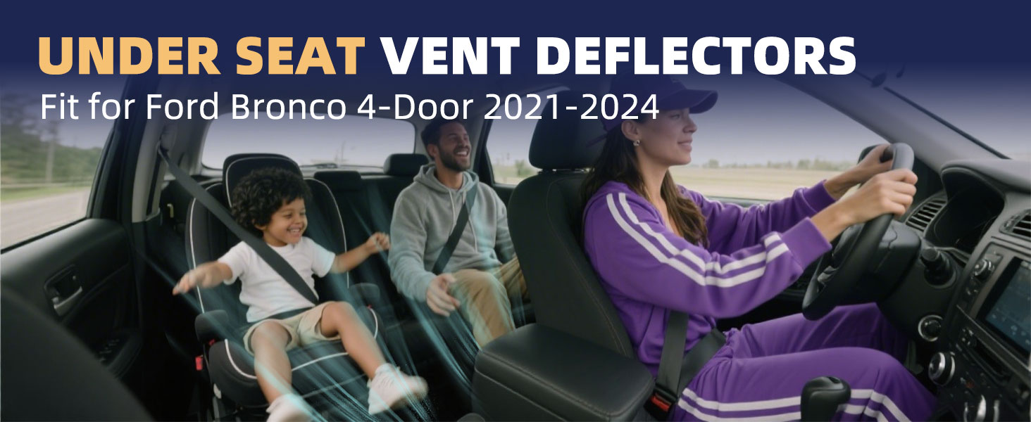 الملاءمة - تناسب عاكسات التهوية أسفل المقعد موديلات 2021-2025 Ford Bronco ذات 4 أبواب (غير مناسبة لموديلات Bronco Sport أو ذات بابين). تناسب OEM أو بدون سجادات أرضية