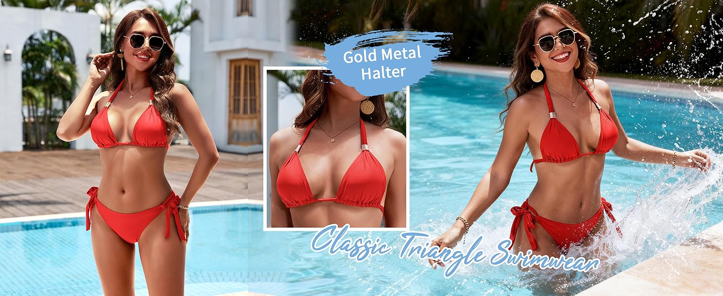 البيكيني المثلث: البيكيني الجذاب يحتوي على معادن ذهبية تجعله أكثر أناقة من البيكيني التقليدي. تحتوي الأكواب على حشوة قابلة للإزالة ويمكنها توفير الدعم والتغطية الجيدة. تتيح ربطات العنق الخلفية وربطات العنق سهولة التعديل للحصول على ملاءمة جيدة