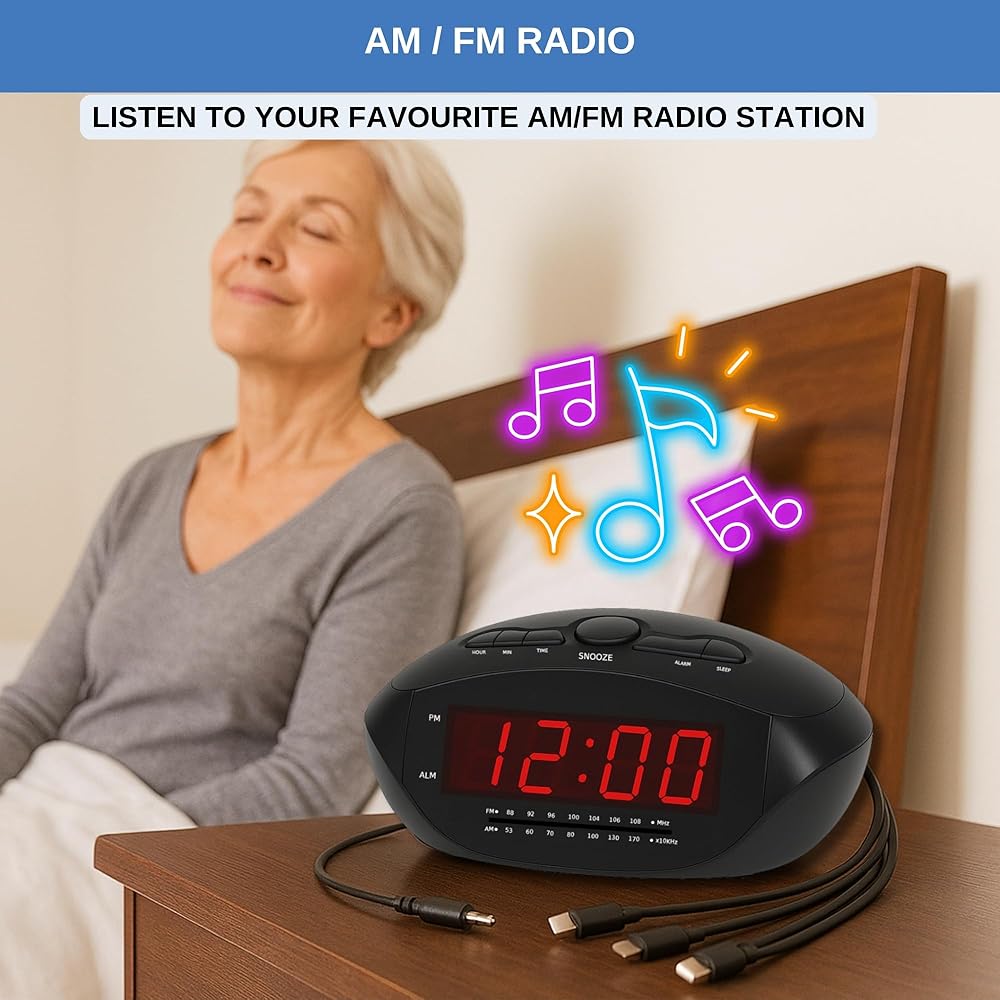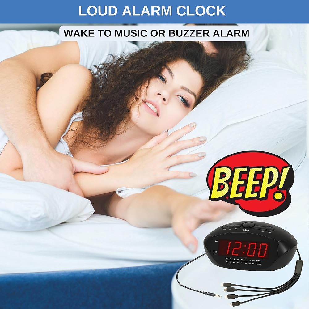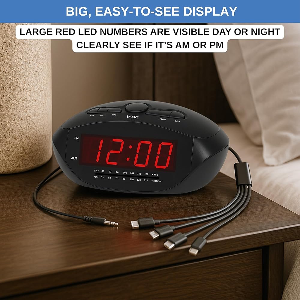 ساعة منبه رقمية مع USB-C وMicro USB وMini USB وكابلات شحن ذات 8 سنون على طراز Apple | راديو ساعة AM/FM مع شاشة LED حمراء، ومدخل AUX، ومنبه عالٍ لمن ينامون بكثرة | مكتب أو ساعة بجانب السرير