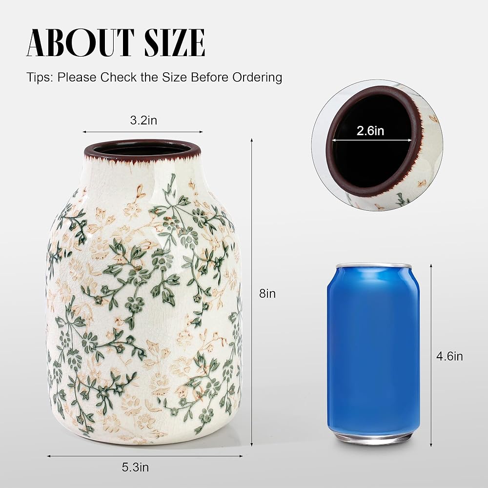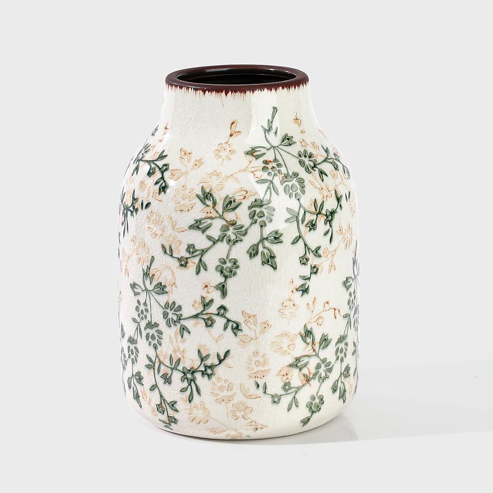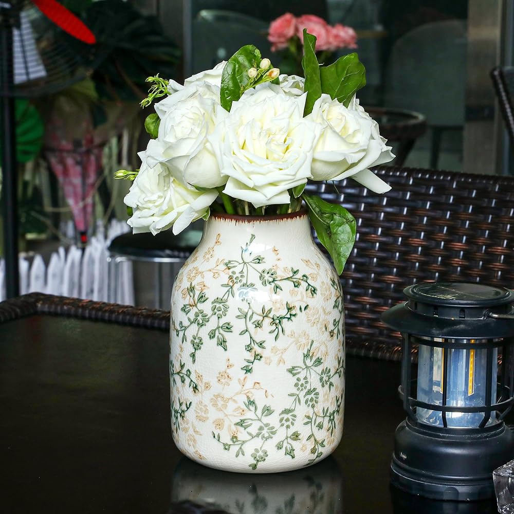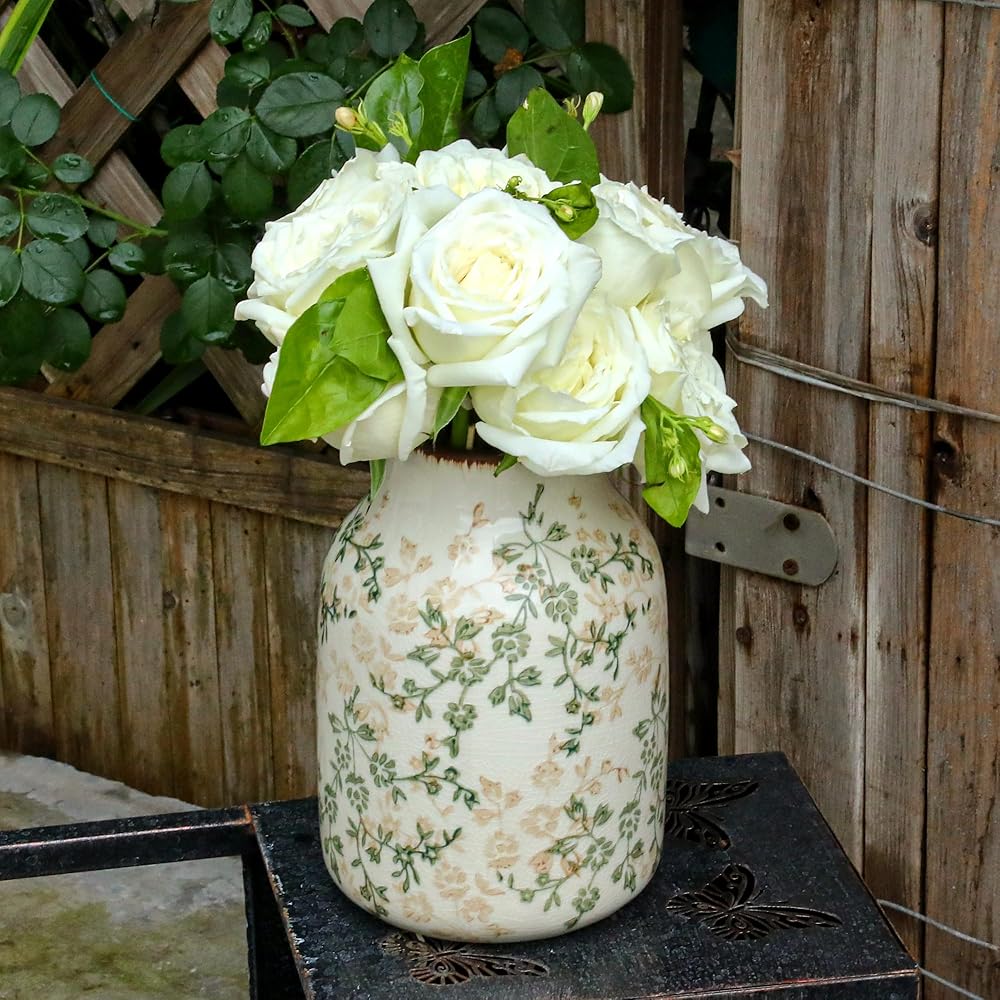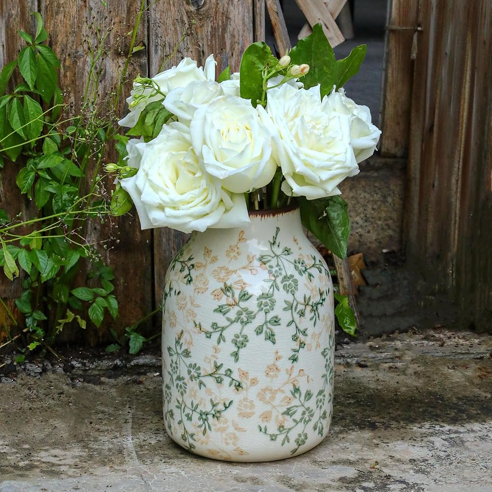 مزهرية سيراميك ريفية باللونين البيج والأخضر، مزهرية تزيينية مصنوعة يدويًا لبيت المزرعة، سهلة التنظيف مثالية لزهور الزفاف أو ديكور الرف 8 بوصة