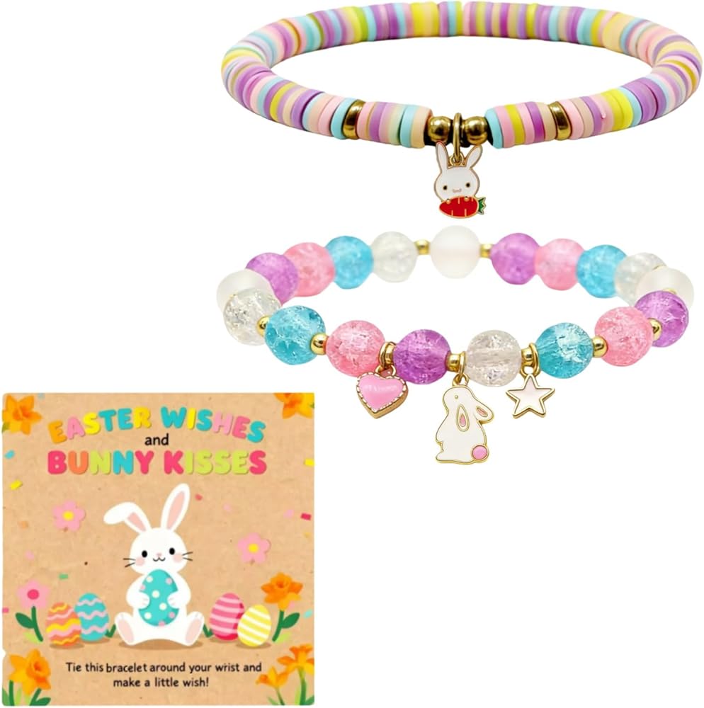 Easter Bracelets Gifts for Women Easter Basket Stuffers,Cute Bunny Charm Stretch Beaded Bracelet with Card,Rabbit Easters Egg Fillers for Gir Teens Jewelry Gifts Holiday Party Accessories