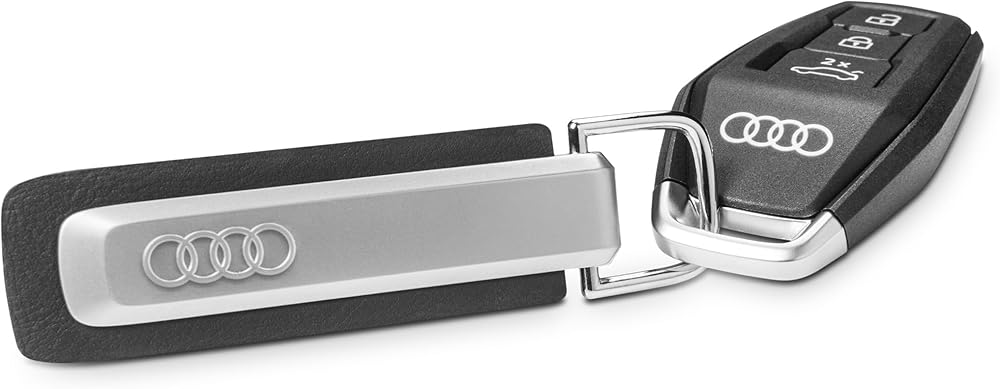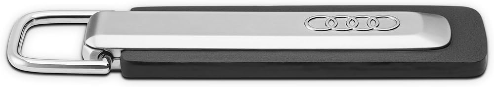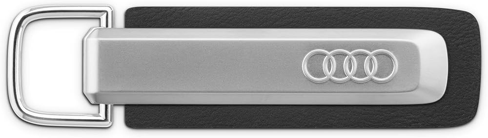 Metal key ring in combination with original Audi seat leather Valcona, designed by Audi designers, inspired by the Audi design language, easy to use by lifting and turning the key ring, Audi vehicle key can be attached without additional split ring, made in Germany