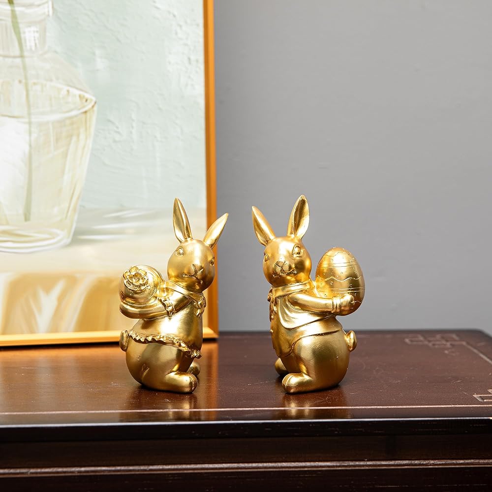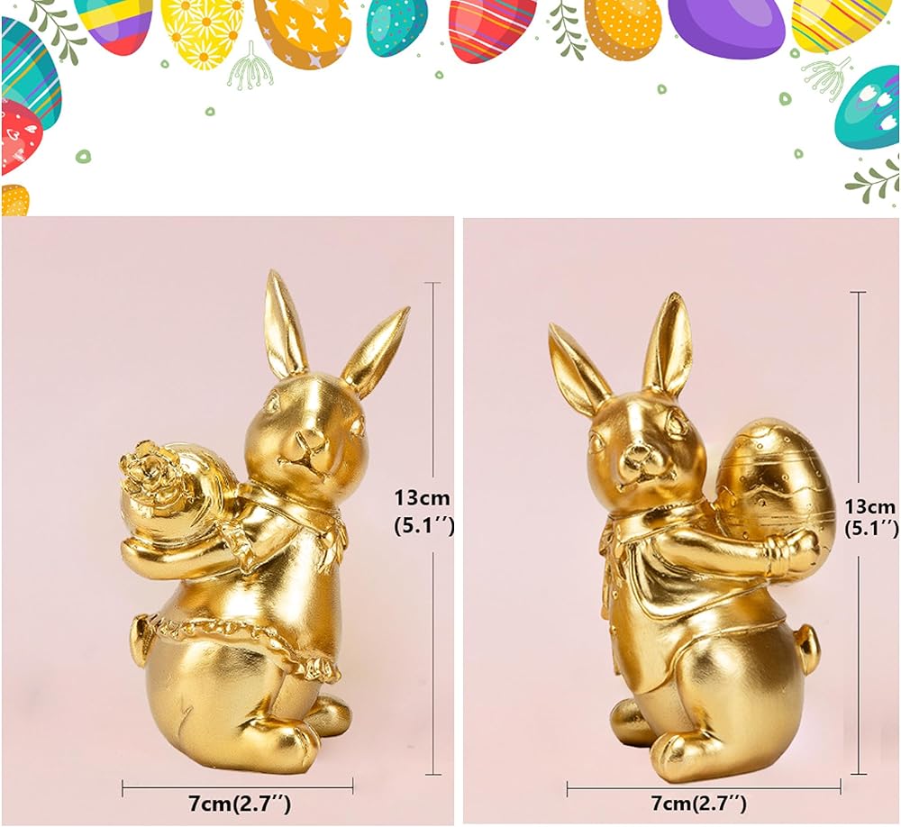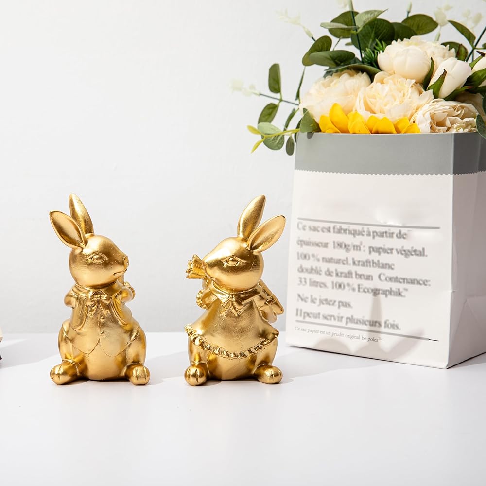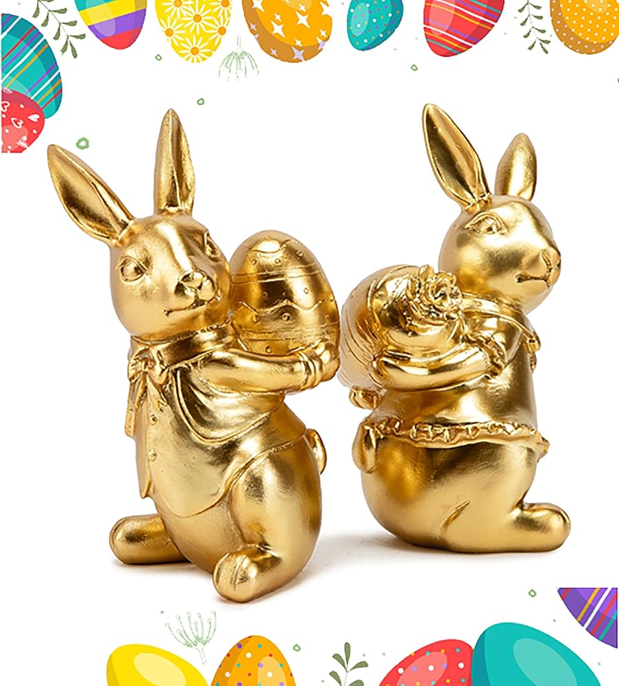 ديكور أرنب عيد الفصح: مجموعة من تمثالين أرنب مطليين بالذهب مع تفاصيل زخرفية بما في ذلك ربطات العنق والياقات المكشكشة لعرض عيد الفصح الأنيق.