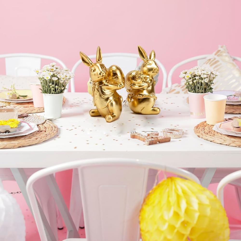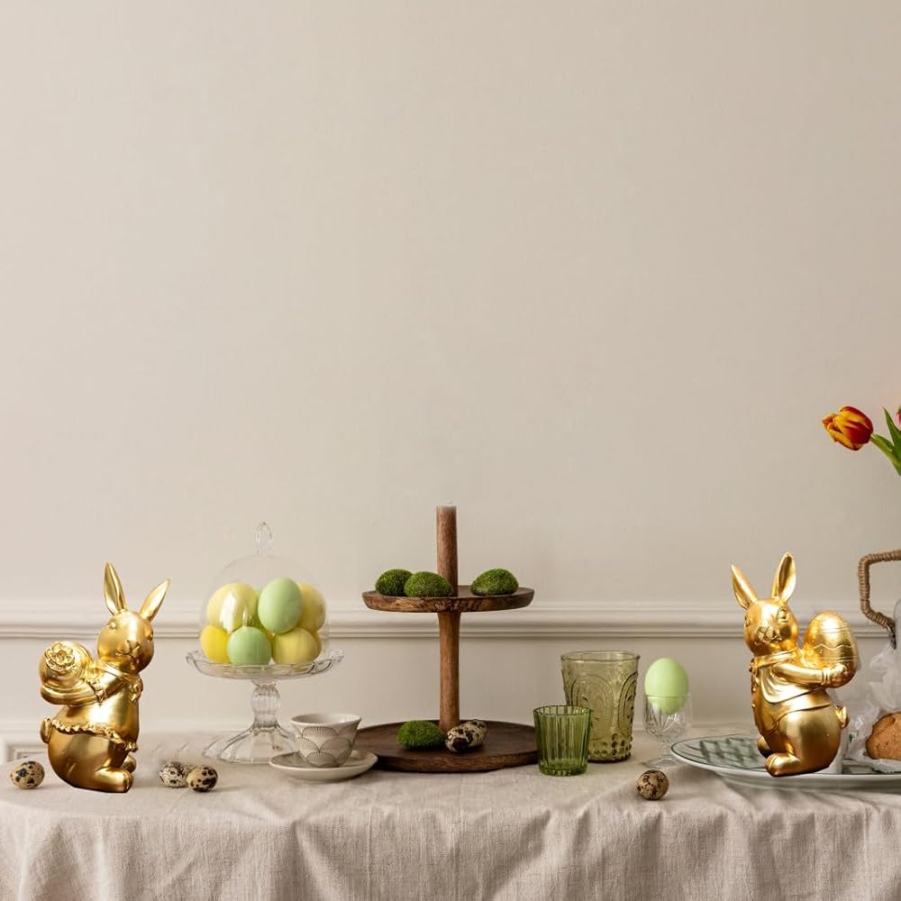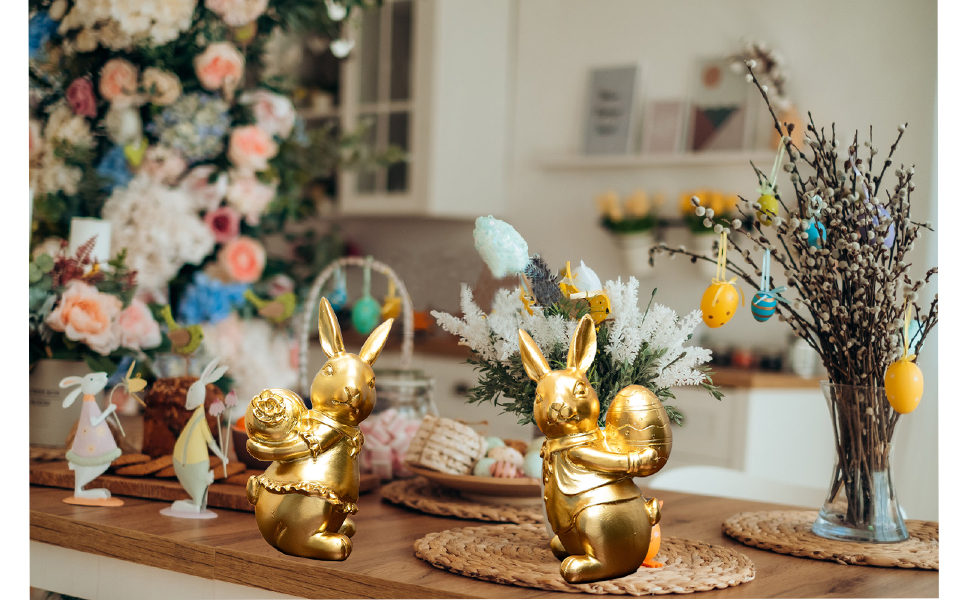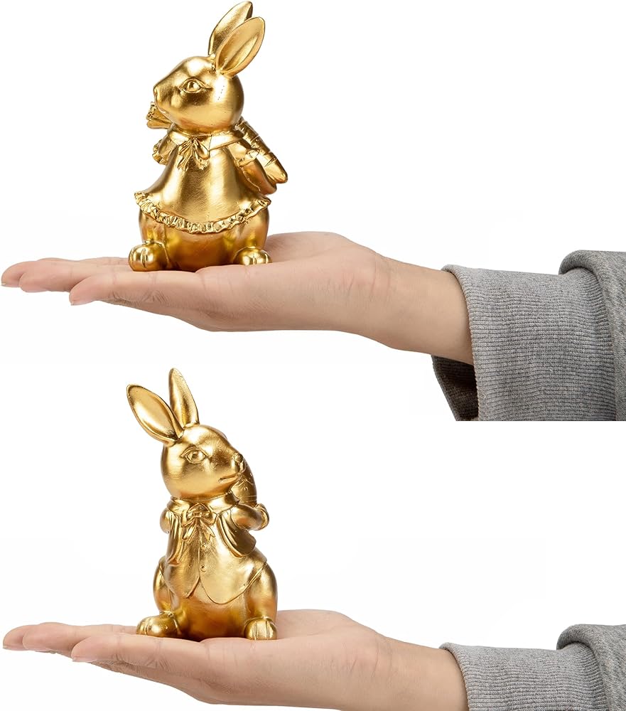 ديكور أرنب عيد الفصح: مجموعة من تمثالين أرنب مطليين بالذهب مع تفاصيل زخرفية بما في ذلك ربطات العنق والياقات المكشكشة لعرض عيد الفصح الأنيق.