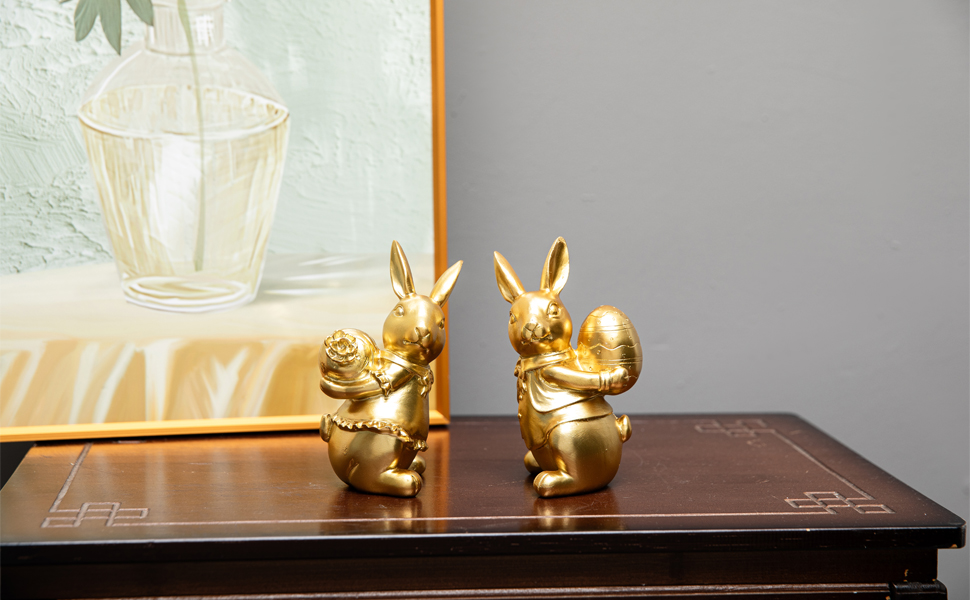 المادة: أرنب عيد الفصح الذهبي مصنوع من مادة الراتنج المتينة. نسيج تمثال الأرنب الذهبي ناعم ورقيق.