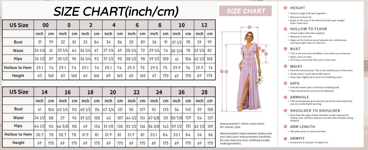 • Custom:For customization,please send us your measurements(All in inch)bust,waist,hips,high heels height.Then we will make the dress fit you perfect.