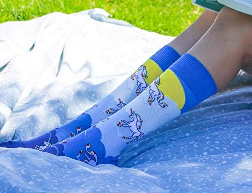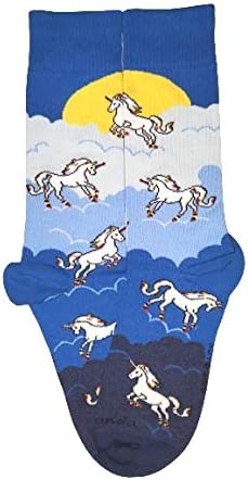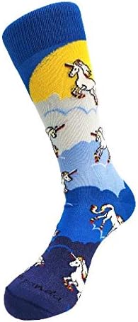 These are special socks. These fantastic unicorns are flying through the clouds, and they are wearing rainbow-colored socks.