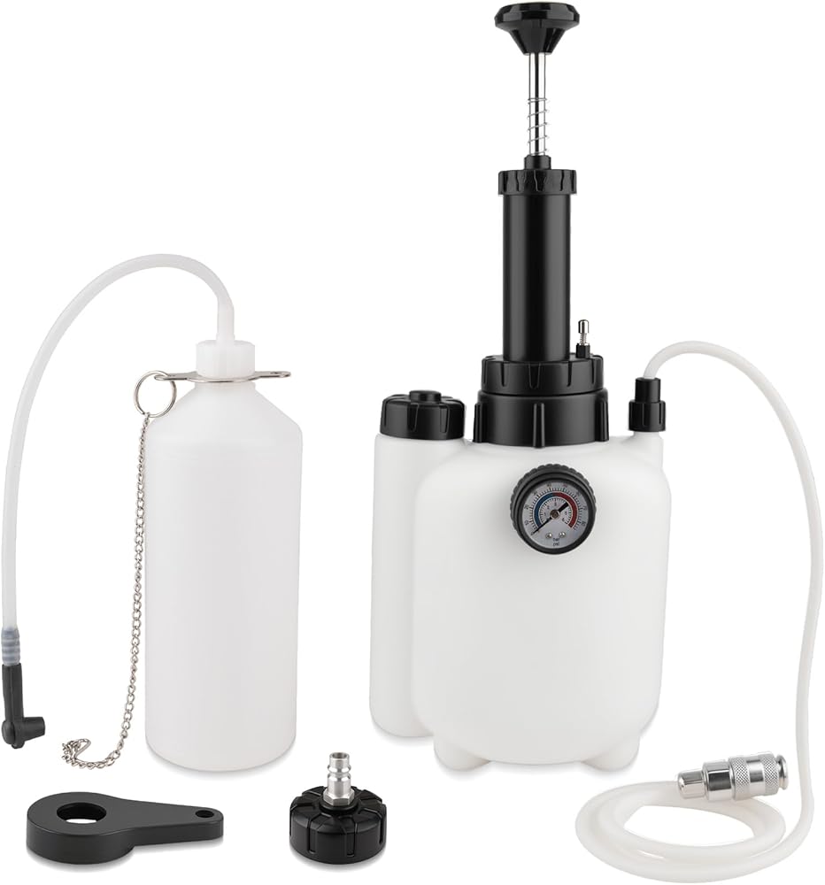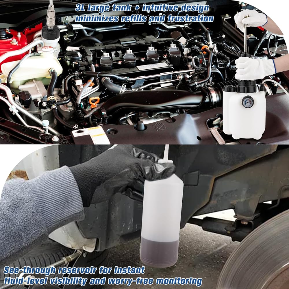 مجموعة نزف الفرامل 3 لتر مع زجاجة نزف السوائل 1 لتر، مجموعة نزف الفرامل اليدوية مع محول الأسطوانة الرئيسية (50 مم)، مجموعة مضخة تفريغ الفرامل النازفة المقاومة للتسرب مناسبة لمعظم المركبات