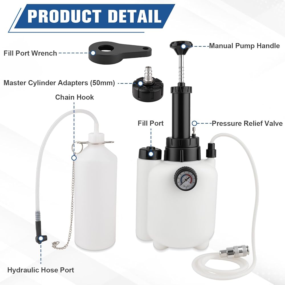 【مجموعة كاملة من الدرجة الاحترافية】تشتمل مجموعة نزيف الفرامل من AJulyBee على وعاء ضغط يدوي سعة 3 لتر، ومجمع زيت سعة 1 لتر مزود بخطاف سلسلة، ومحولات أسطوانة رئيسية (50 مم) ومفتاح منفذ حشو.