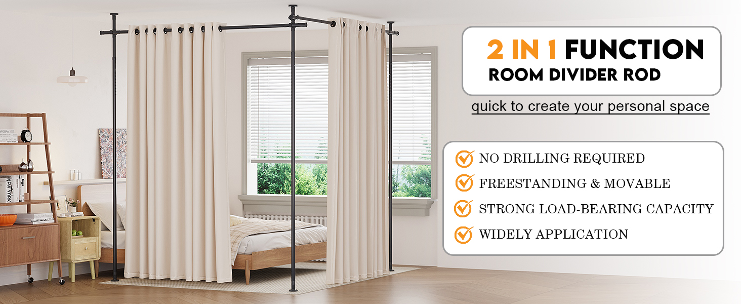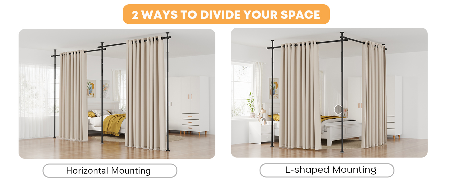 خيارات العرض المزدوج للمرونة القصوى: يأتي قضيب الستارة المقسم للغرفة مع خيارين للعرض قابلين للتعديل (110 بوصة/180 بوصة) ويمكن تعديل الارتفاع من 48 بوصة إلى 10 أقدام ليناسب تمامًا أي حجم مساحة. قم بتخصيص الطول بسهولة عن طريق إضافة أو إزالة القضبان رقم 3 القابلة للتوسيع. سواء كنت تريد إنشاء زاوية مريحة في مسكنك أو مقسم الغرفة، فإن قضبان ستائر مقسم الغرفة القابلة للتعديل لدينا توفر المرونة التي تحتاجها. مناسب تمامًا لغرفة المعيشة أو غرفة النوم أو المكتب.