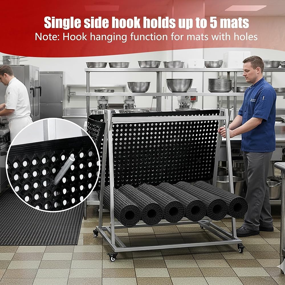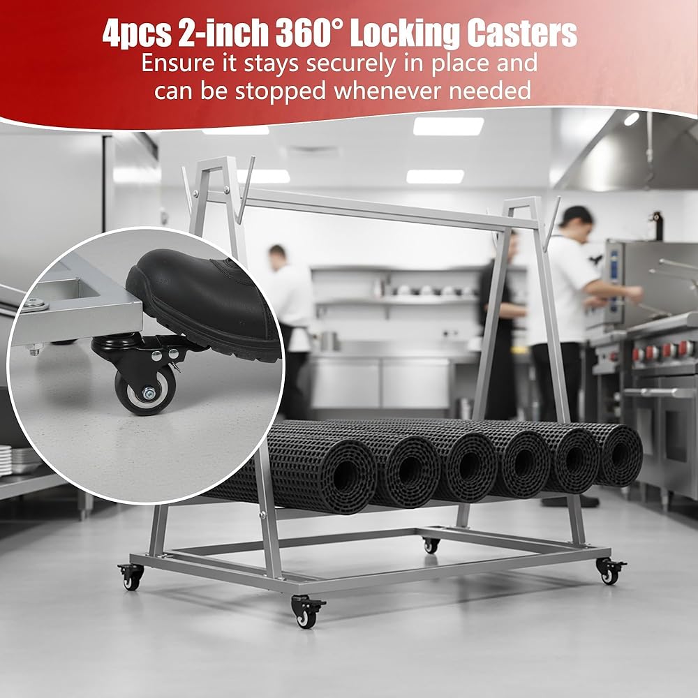 رف غسيل الأرضية وناقل الحصيرة مع عجلات، وعربة غسيل السجادة والنقل مقاس 40 بوصة × 28 بوصة × 42 بوصة، رف تخزين متدحرج من الفولاذ الفضي، مناسب لحصائر الصرف الصناعية وحصيرة الأرضية التجارية