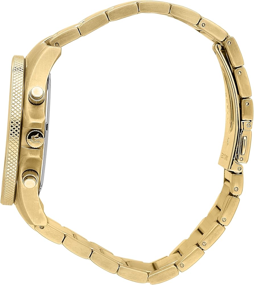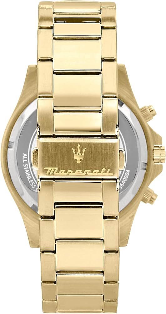 Maserati men's watch, Sfida Collection, ref. R8873640005, MVT MIYOTA JS25 TYPE M DATE 4,5H BLK B/G quartz movement, chronograph, made of stainless steel, yellow gold pvd. The watch is equipped with a stainless steel strap, with fold-over clasp with safety. The round 44mm case encloses an elegant yellow gold dial and features a mineral crystal. Water resistant up to 10 ATM. The watch is contained in its Maserati official presentation box, with 2-years warranty. Maserati Sfida Collection: watches with a well-defined design, characterized by the important steel case (44mm) with a rotating bezel - or tachometric bezel - with knurling finish on the side. Chronographs, automatic and three hands are offered with sunray dial or in the modern dégradé version.