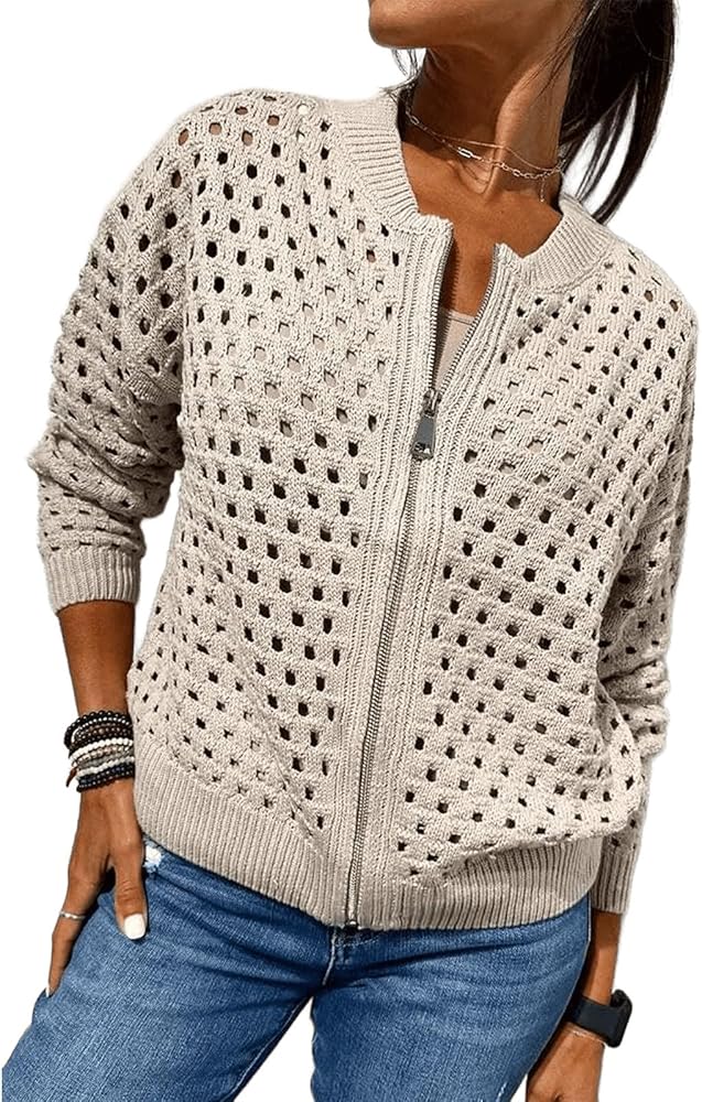 التصميم: سترة محبوكة بأكمام طويلة، سترة كروشيه للسيدات تتميز بسحاب كامل، ورقبة دائرية، ولون ثابت ومقاس قصير. يخلق التصميم المجوف هيكلًا شبكيًا، مما يعزز العمق البصري وجاذبية الموضة.