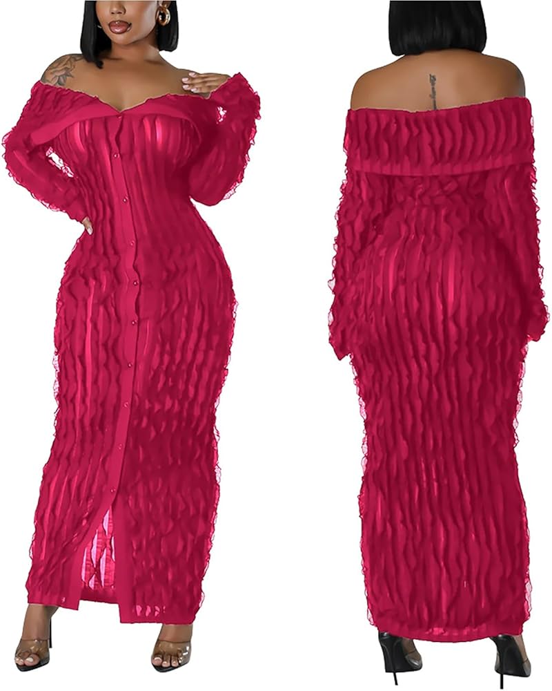 المزايا: فستان نسائي طويل بدون أكتاف وأكمام طويلة وأزرار سفلية شبكية مكشكشة، فساتين مثيرة قابلة للتمدد، فساتين متوسطة الطول شفافة للخروج في النادي الليلي، فستان نسائي متوسط الطول مثير بطيات وأزرار سفلية. القماش ناعم وصديق للبشرة ومريح، ومناسب لأسلوبك العصري وشكلك المنحني.