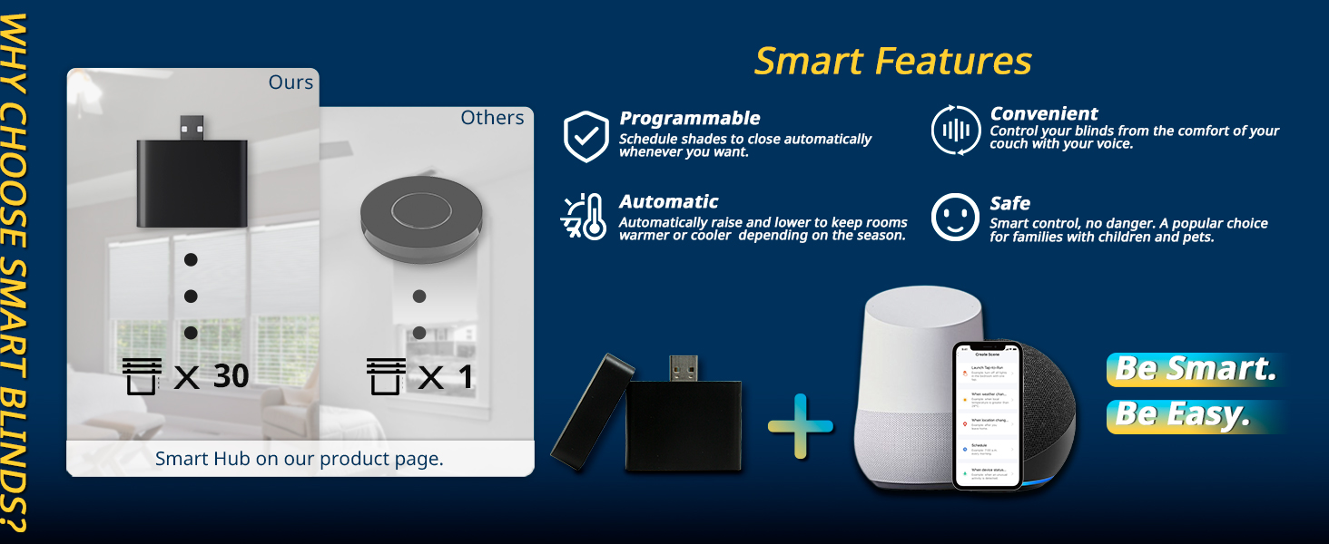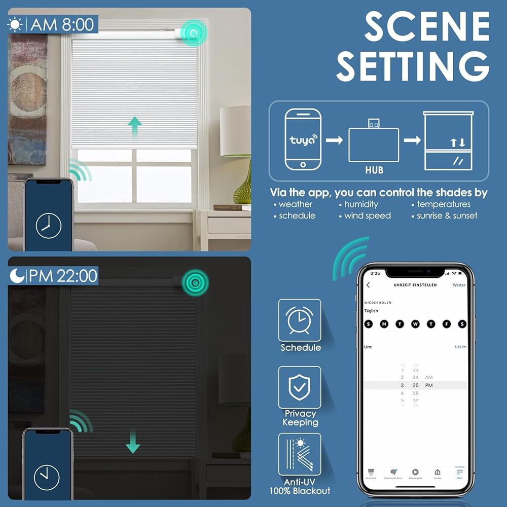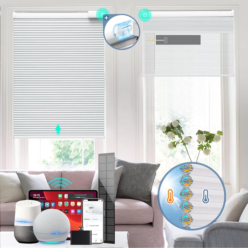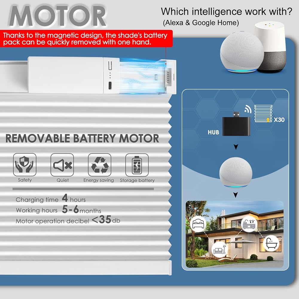 [التحكم من أي مكان وفي أي وقت]: يمكنك التحكم بسهولة في الستائر الذكية بلمسة زر واحدة، أو نقرة على جهازك المحمول، تلقائيًا، أو حتى بصوتك (يتطلب المحور). أثناء الاستلقاء على أريكتك بشكل مريح، اطلب من مساعدك الصوتي ضبط موضع ستائر Alexa. امنح منزلك مظهرًا حيًا أثناء تواجدك بعيدًا عن طريق جدولة الستائر الذكية للرفع والخفض تلقائيًا في أوقات محددة. يمكن التحكم في الظلال الخلوية على شكل قرص العسل عن بعد من الهاتف، مما يعزز الأمان بشكل كبير.