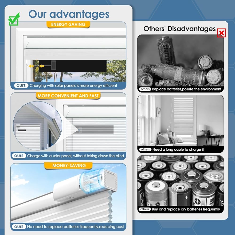 [الشحن بالطاقة الشمسية]: اشحن ستائرك الذكية بالشمس، ويوفر شاحن اللوحة الشمسية الخاص بنا شحنًا ثابتًا للبطارية. وهذا يعني أنك لم تعد بحاجة إلى صعود السلالم العالية لإزالة ظلال الخلايا، ولا تكلفة ومتاعب إعادة شراء البطاريات. يتم توفير لوحة شمسية باهظة الثمن مجانًا، فقط لتتمكن من الحصول على تجربة أفضل عند استخدام الستائر الخلوية على شكل قرص العسل! بطارية الليثيوم الخارجية ذات الشفط المغناطيسي مليئة بالتكنولوجيا، قابلة للإزالة وإعادة الشحن!