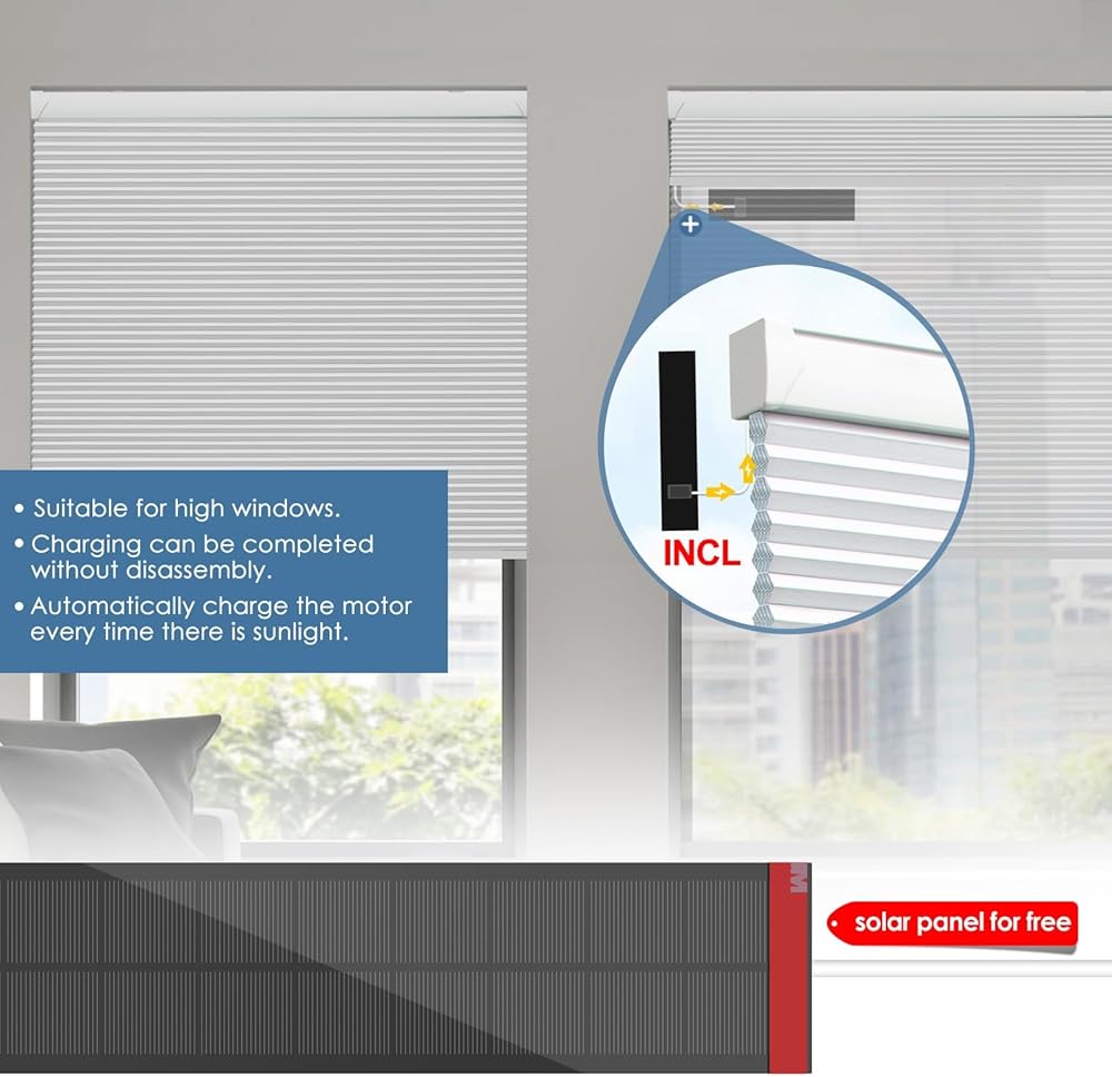 ظلال خلوية بمحرك مع جهاز تحكم عن بعد، ستائر كهربائية ذكية معتمة (لوحة شمسية مجانية) مع ستائر لاسلكية على شكل قرص العسل، مع Alexa Google، أبيض، 36 بوصة × 64 بوصة