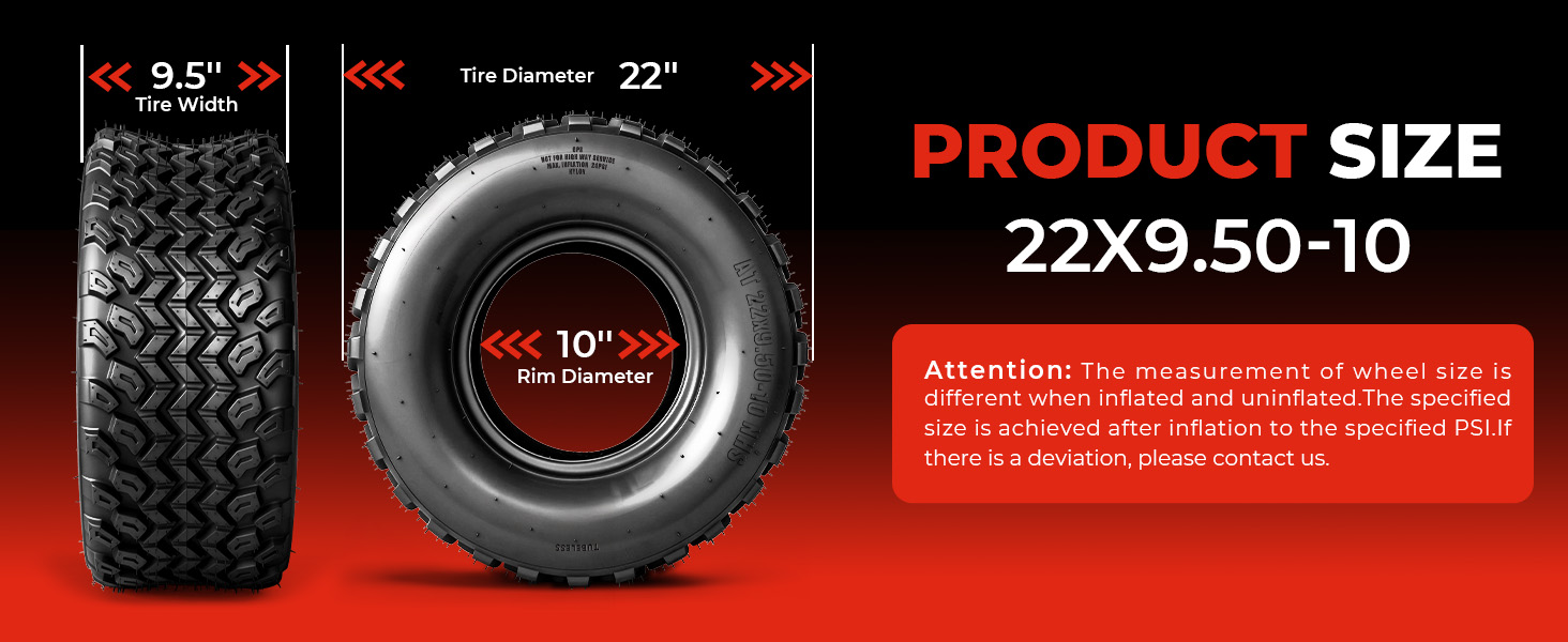 أبعاد الإطار: إطارات ATV 22x9.5x10، عمق المداس: 11 مم، عرض الحافة: 8 بوصة، قطر الحافة: 10 بوصة، الحد الأقصى للحمولة: 340 رطل، مؤشر السرعة F، Psi: 24، بدون أنبوب.