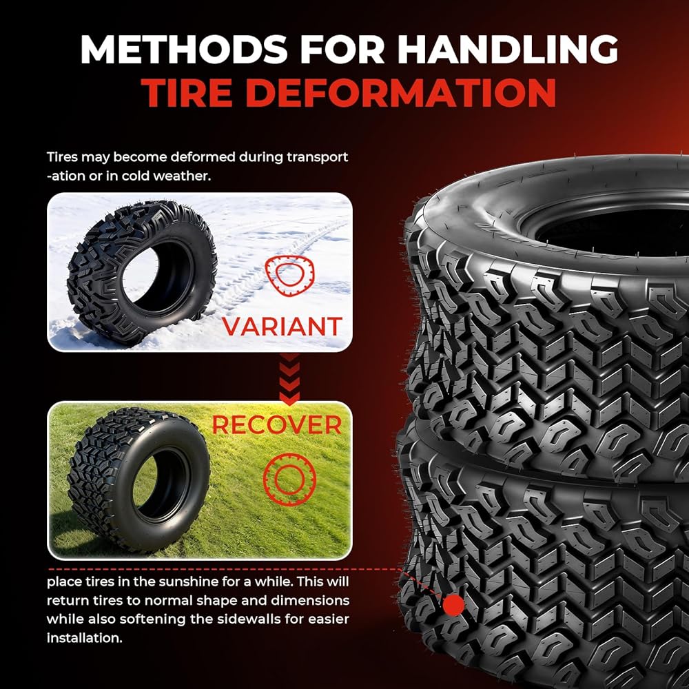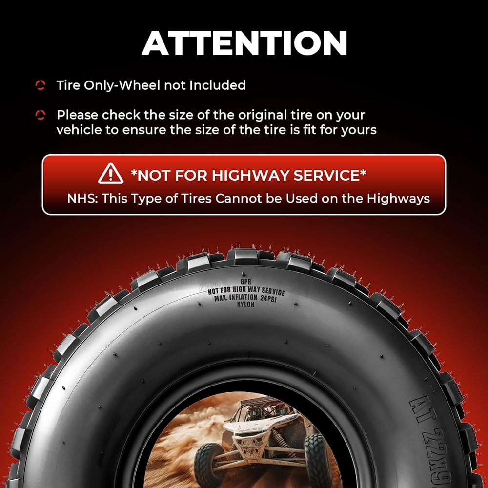 توافق واسع للمركبة: يناسب مواصفات الحجم 22x9.5-10 (22x9.5x10) وإطارات 10 بوصة؛ مناسبة لمعظم موديلات ATV وUTV، بالإضافة إلى جزازات العشب والمركبات المساعدة. غير مخصصة للاستخدام على الطرق السريعة.