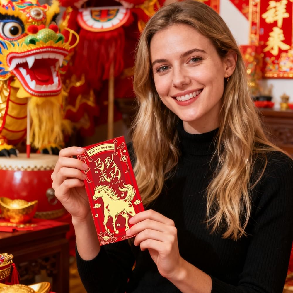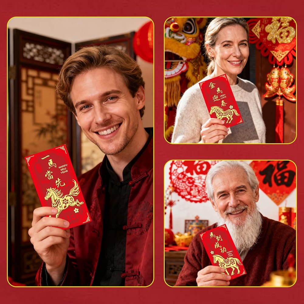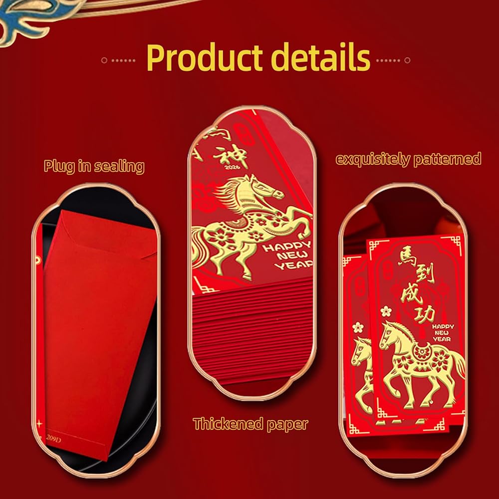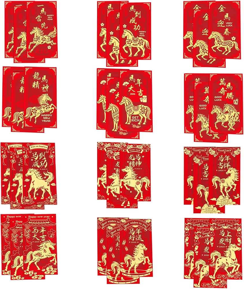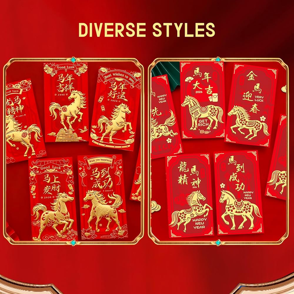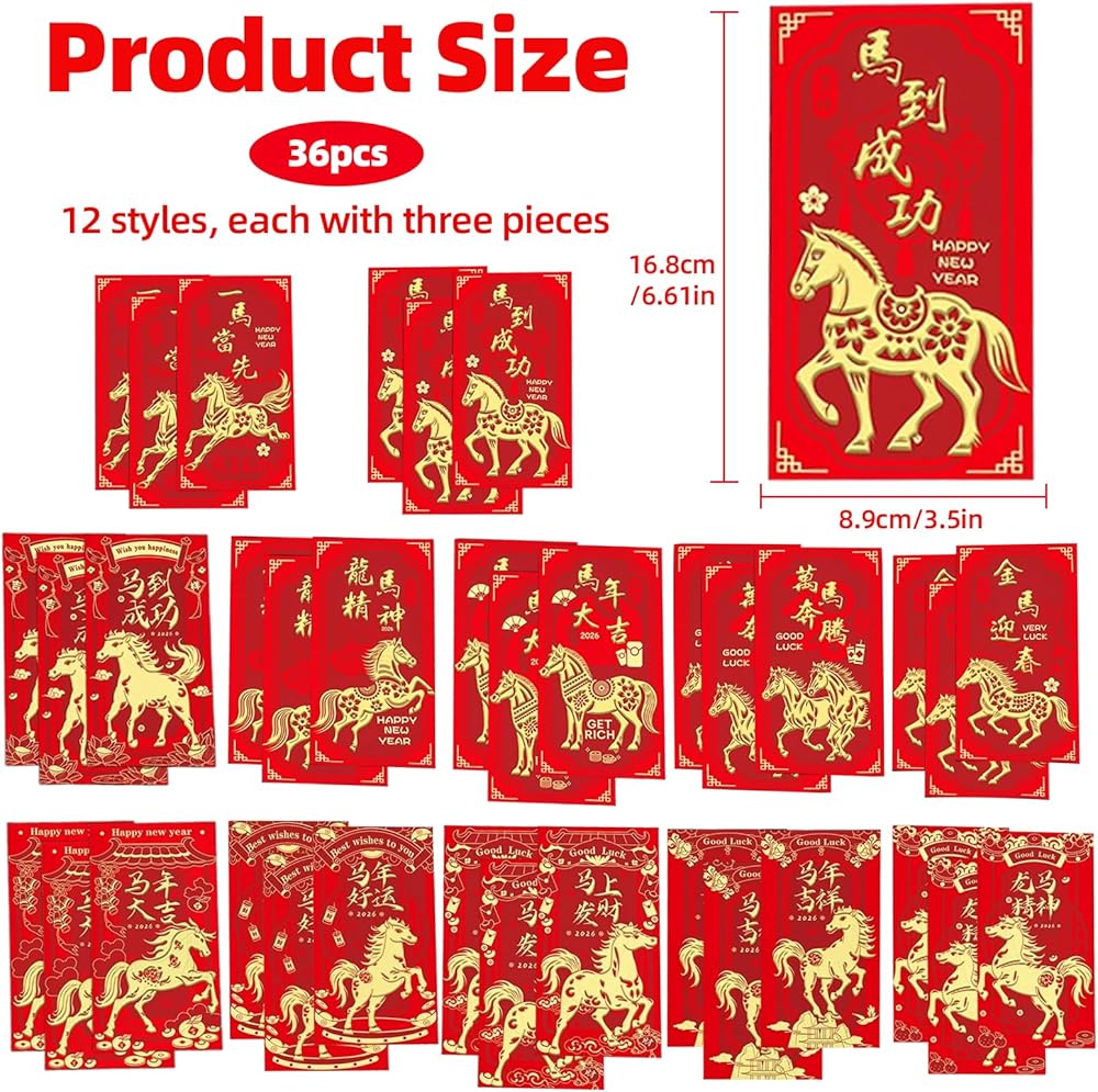Set of 36 Envelopes Great Value:Includes 36 red envelopes,each Packaging contains 6 different Year of Horse designs, 6 per Packaging. enough for your festive needs without running out during the holiday seasonality.