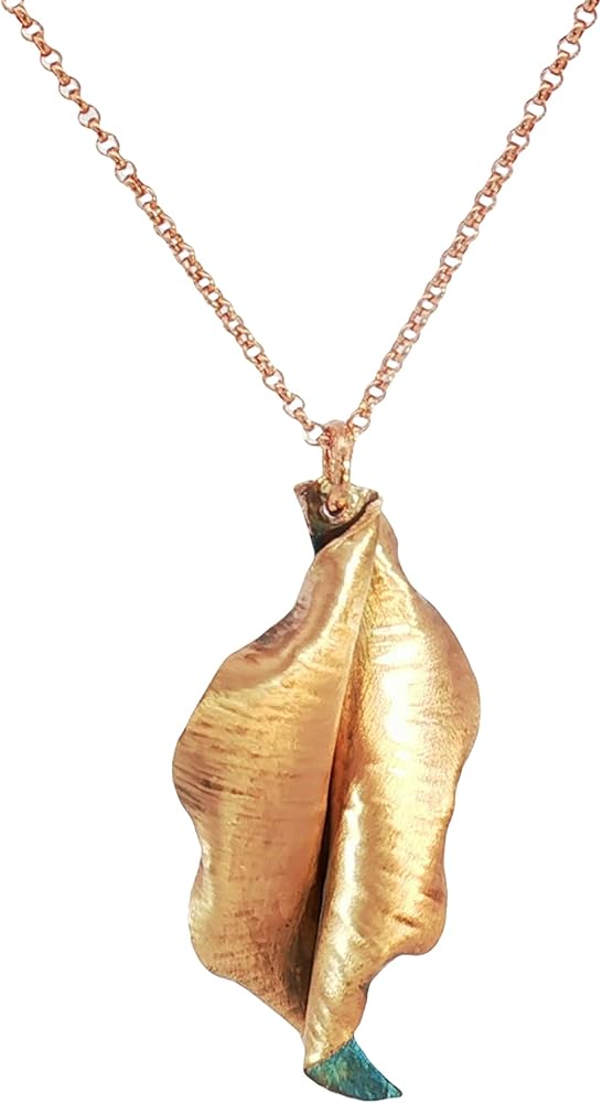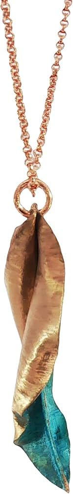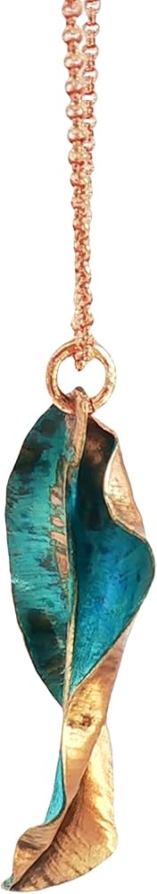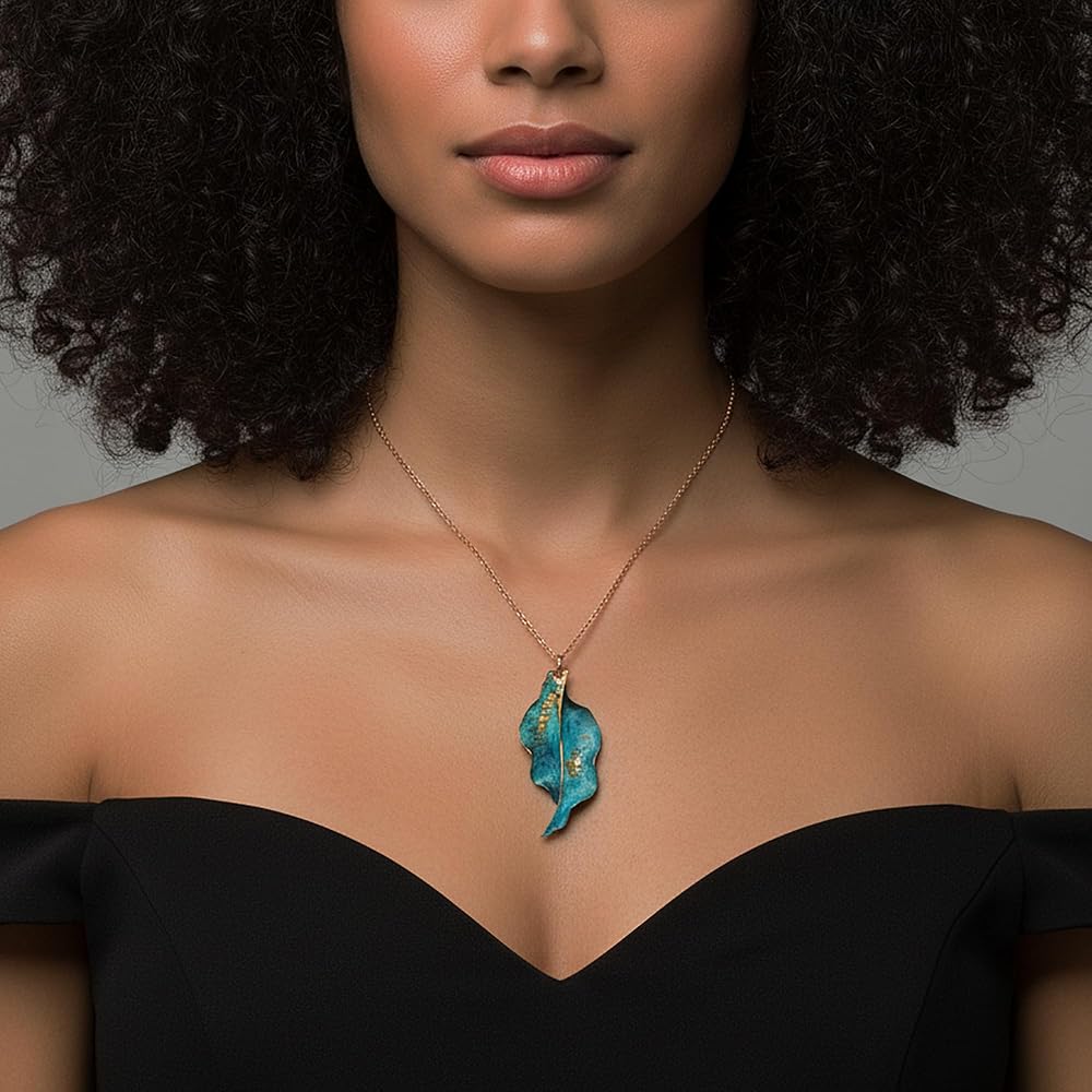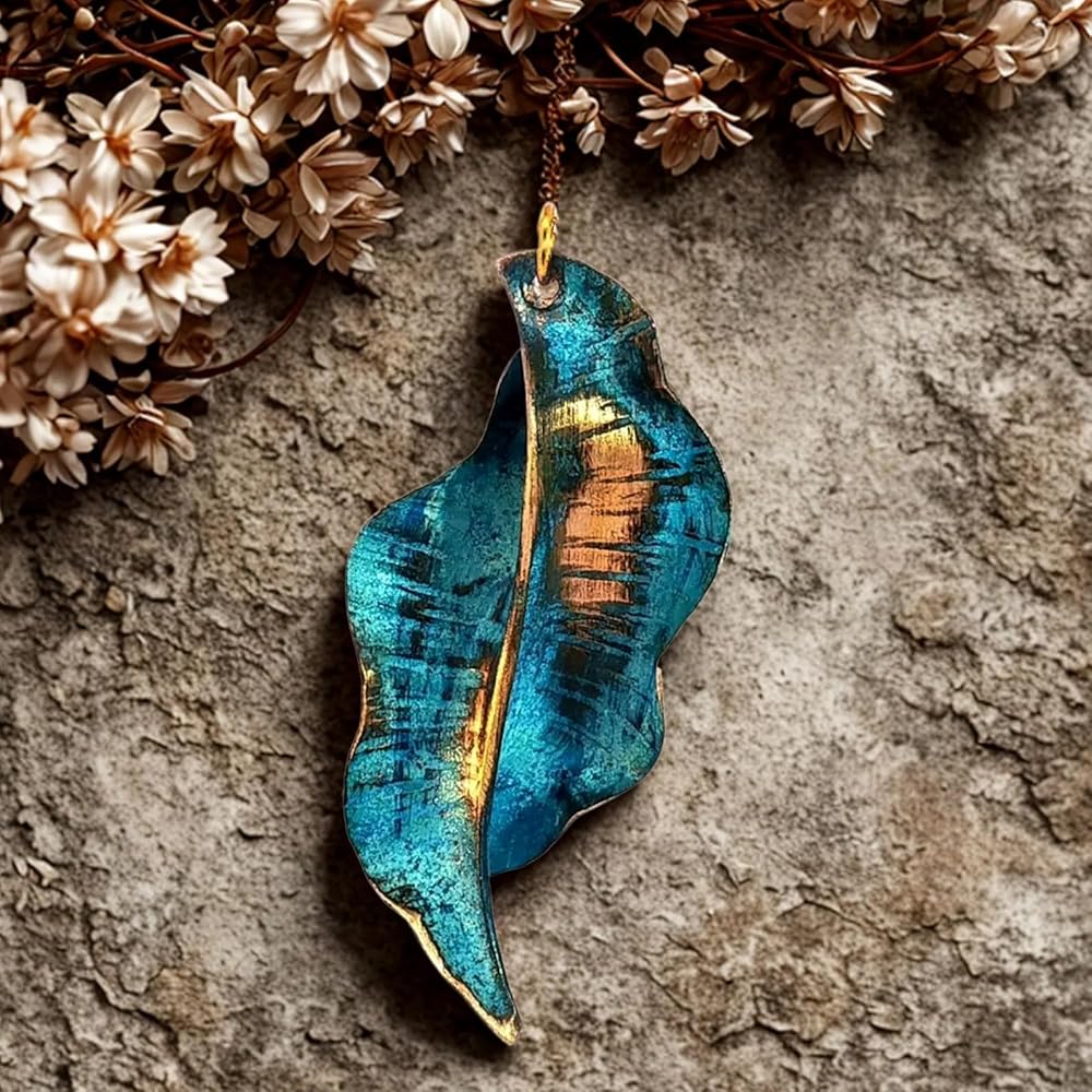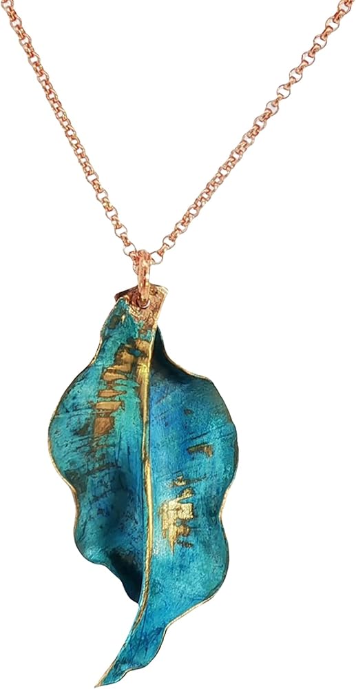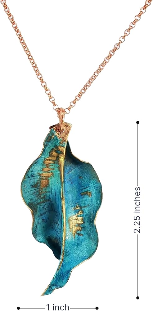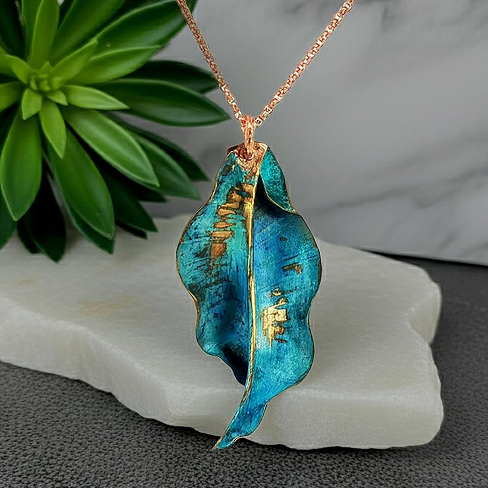 Transform your look with this stunning handcrafted copper leaf pendants, featuring an enchanting teal verdigris patina that tells a story of weathered beauty. Each piece is meticulously crafted from solid copper and treated through a specialized reactive process using copper salts, resulting in a mesmerizing weathered metal appearance that's truly one-of-a-kind. The organic leaf design showcases intricate details with a harmonious blend of teal blue patina and warm copper undertones, making them perfect for nature-inspired fashion statements. These statement pieces have been carefully sealed with a protective coating to preserve their unique finish. The pendant strikes an ideal balance between rustic charm and artistic sophistication, making it versatile enough for both casual outings and special occasions. Their distinctive appearance ensures that no two pieces are exactly alike, offering you a truly unique piece of wearable art that captures the natural beauty of aged copper with a contemporary twist.