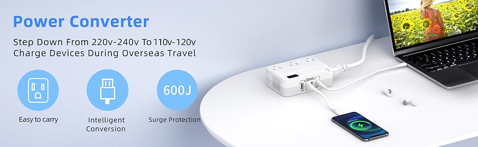 • قم بحماية أجهزتك - يتم إيقاف تشغيل المحول تلقائيًا في حالة الجهد الزائد أو درجة الحرارة الزائدة أو التيار الزائد أو الحرارة الزائدة أو حماية الدائرة القصيرة، لا داعي للقلق بشأن إتلاف أجهزتك.