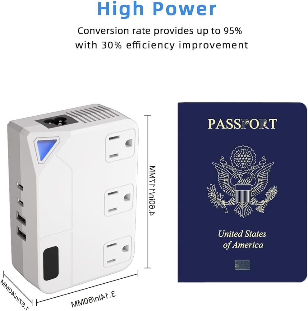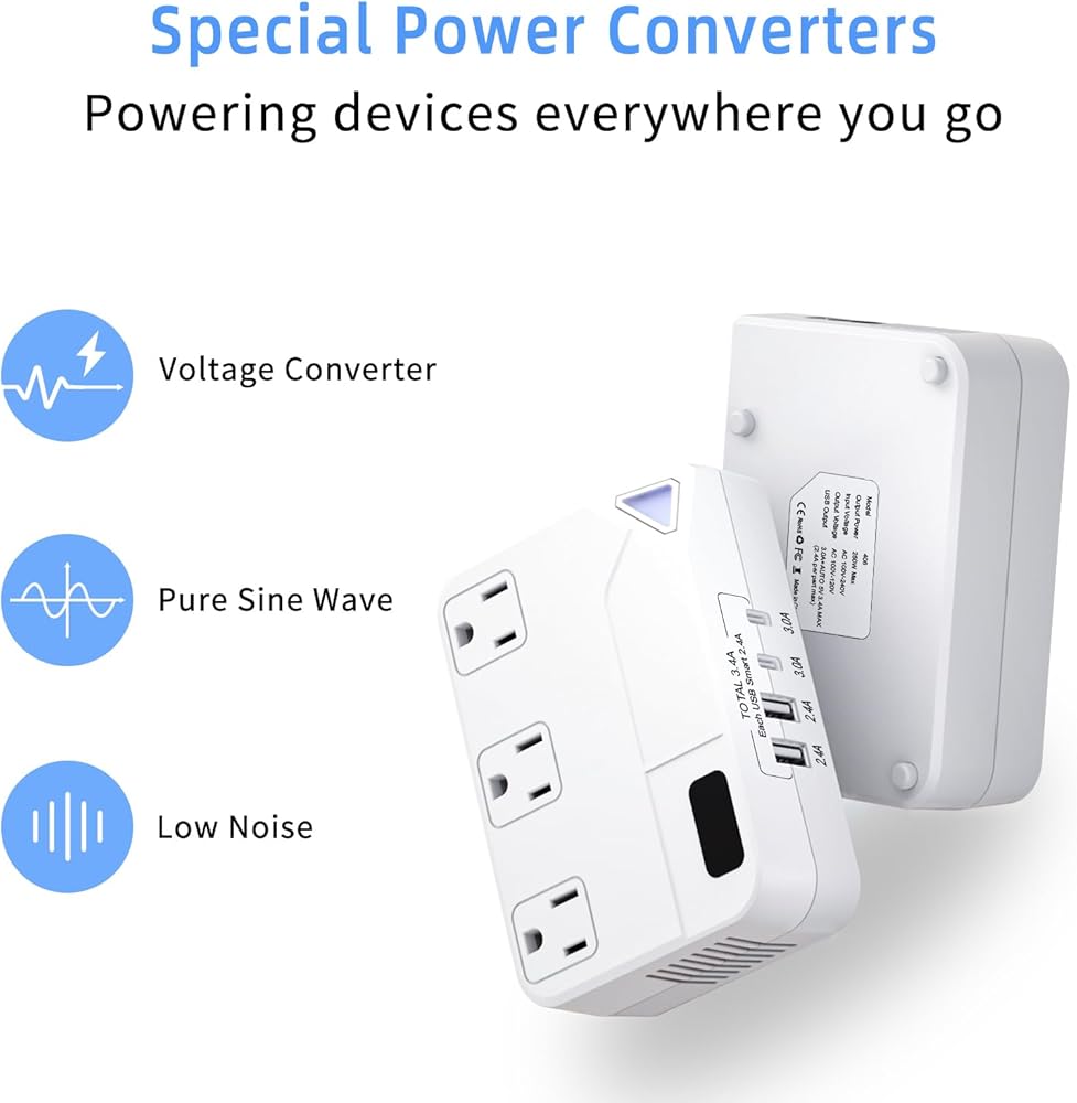 • محول الطاقة - مثالي لاستخدام مكواة تجعيد الشعر وأجهزة فرد الشعر في بلدان 220 فولت، وتحويل تدريجي من 220/240 فولت إلى 110/120 فولت، متوافق مع الأجهزة التي تصل إلى 250 وات، مثل ماكينات الحلاقة الكهربائية/مشذبات الشعر، وفرش الأسنان الكهربائية، والمراوح، والرذاذات، وأجهزة الألعاب، وأجهزة الكمبيوتر المحمول، والهواتف المحمولة والمزيد.