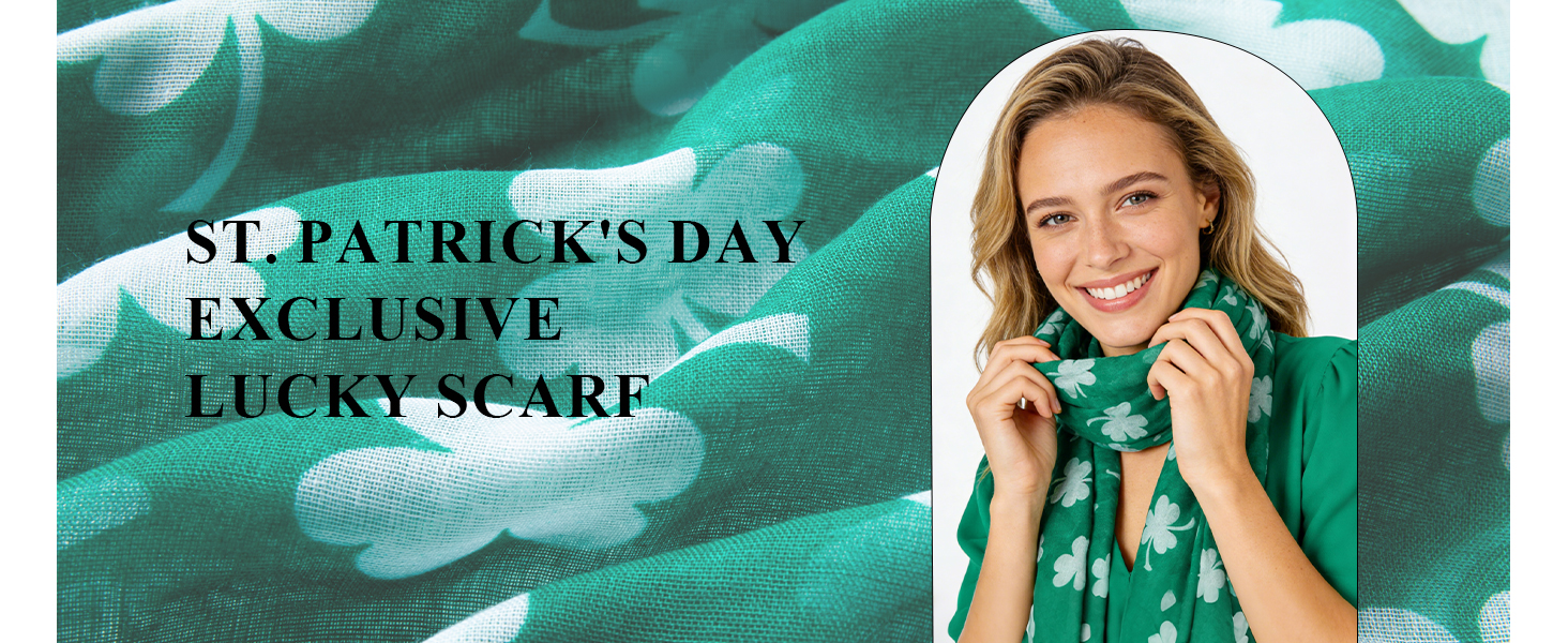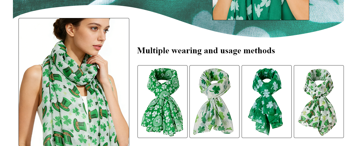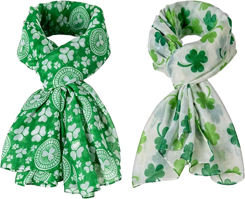 • إكسسوارات يوم القديس باتريك: تتميز الأوشحة النسائية لعيد القديس باتريك بألوان كلاسيكية وأنماط نبات النفل، وهي رائعة وساحرة، وترمز أيضًا إلى الحظ السعيد، وتتماشى مع موضوع يوم القديس باتريك.
