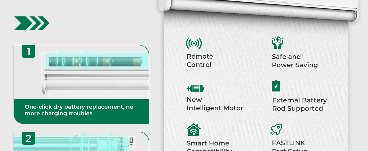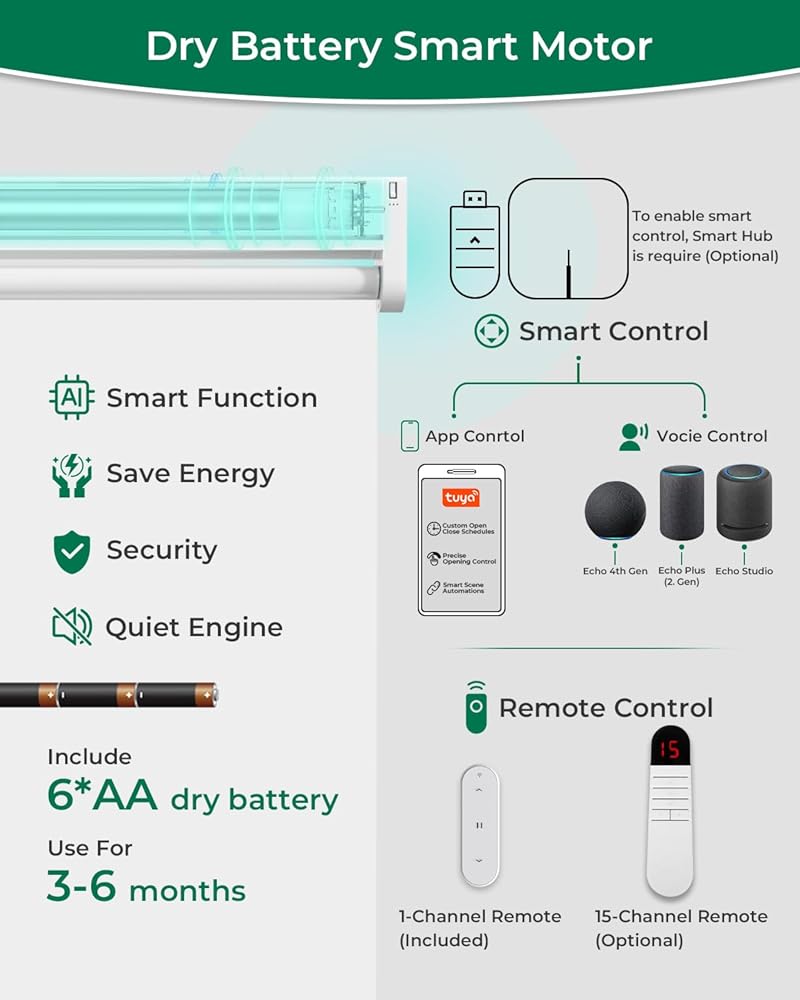 [التحكم عن بعد] يمكنك التحكم في ظلال جهاز التحكم عن بعد بسهولة من أي مكان باستخدام جهاز التحكم عن بعد ذو القناة الواحدة المتضمن. يتيح لك وضع الإدارة الخاص به تخصيص حدود السفر وضبط سرعة المحرك للتشغيل الشخصي. لتوسيع التحكم، يتوفر جهاز تحكم عن بعد اختياري ذو 15 قناة (B0FHKT51RR) لإدارة ظلال ذكية متعددة في وقت واحد