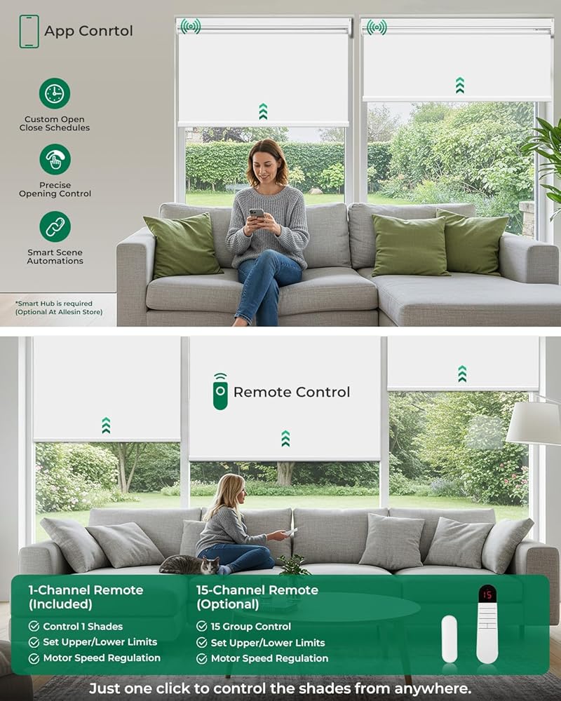 Allesin ستائر دوارة بمحرك مع جهاز تحكم عن بعد للنوافذ، ظلال ذكية أوتوماتيكية للتعتيم، ستارة كهربائية تعمل بالبطارية الجافة (أبيض ثلجي 23 بوصة عرض × 72 بوصة ارتفاع)