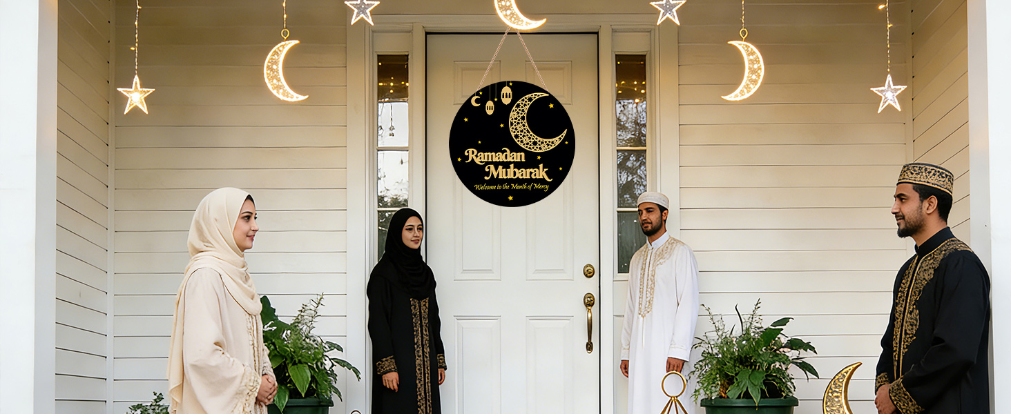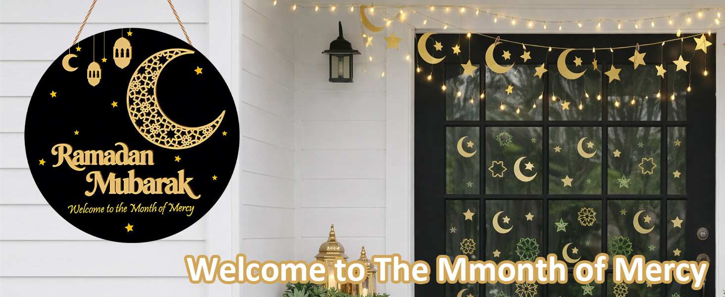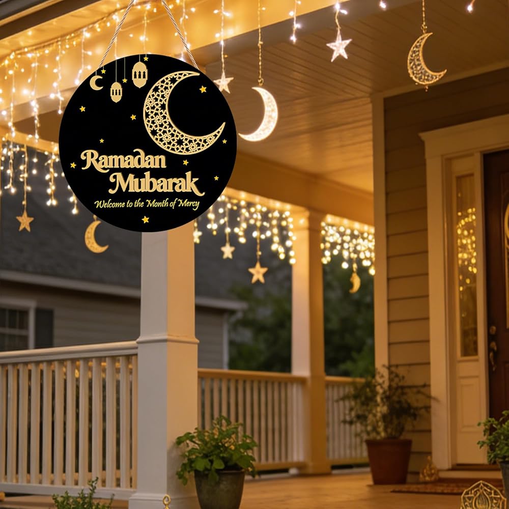 ديكور الباب الأمامي لرمضان: لافتة رمضان مبارك مثالية كديكور رمضان للباب الأمامي، أو لافتة باب رمضان، أو إكليل رمضان مبارك في الهواء الطلق؛ يمكن استخدامها كعلامة باب معلقة لرمضان، علامة ترحيب رمضان مبارك