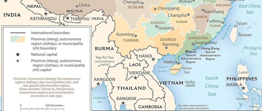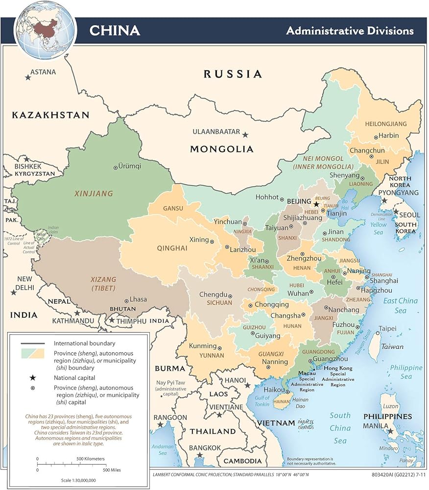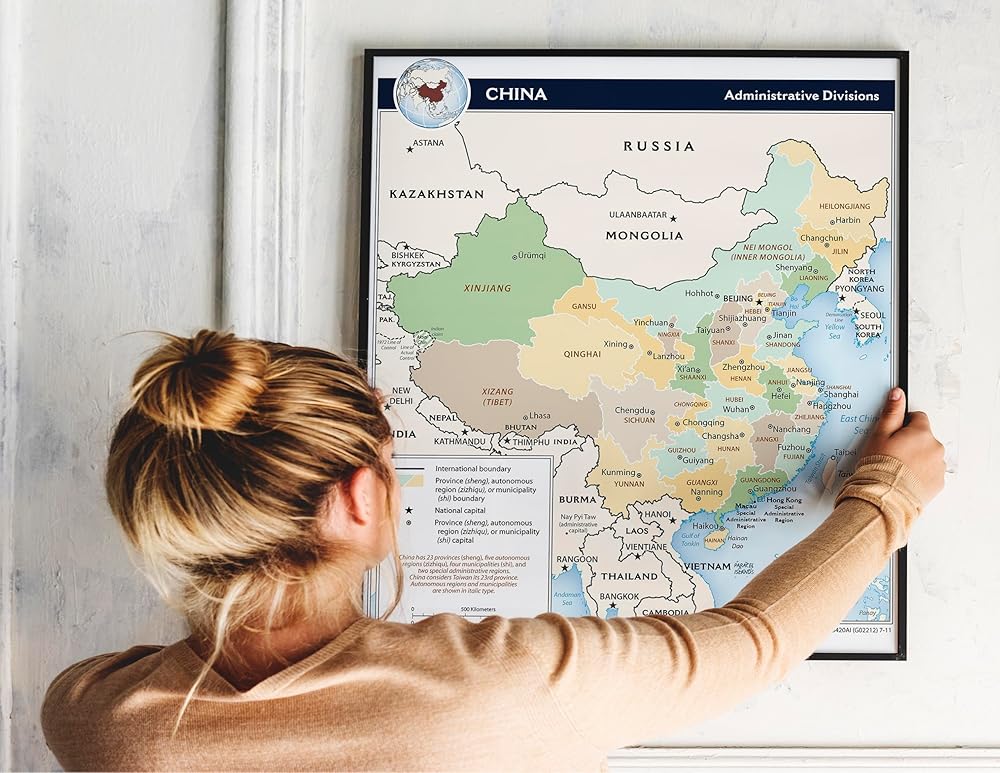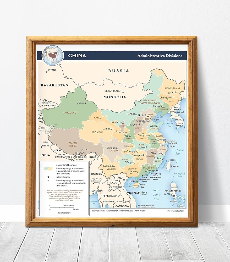 خريطة وكالة المخابرات المركزية غير المؤطرة مقاس 16 × 18 بوصة للتقسيمات الإدارية في الصين؛ تمت طباعة هذه الخريطة على ورق غير لامع ممتاز بوزن 36 رطلاً بأحبار ممتازة مقاومة للبهتان وتتضمن حدودًا بيضاء على جميع الجوانب للسماح بالتلميع والتأطير.