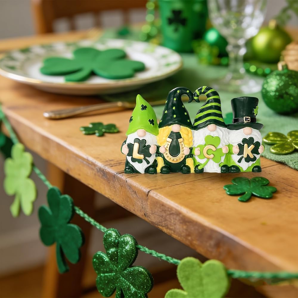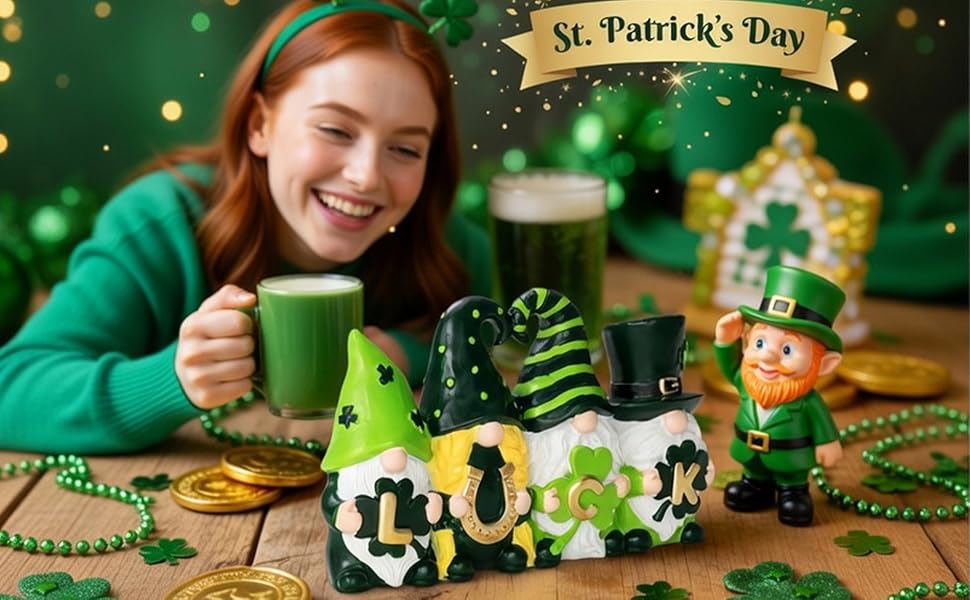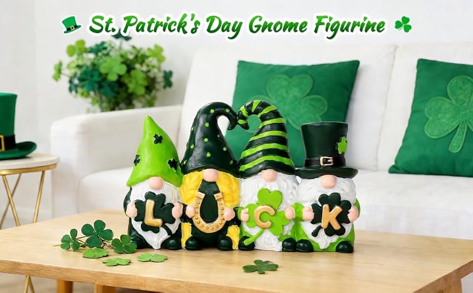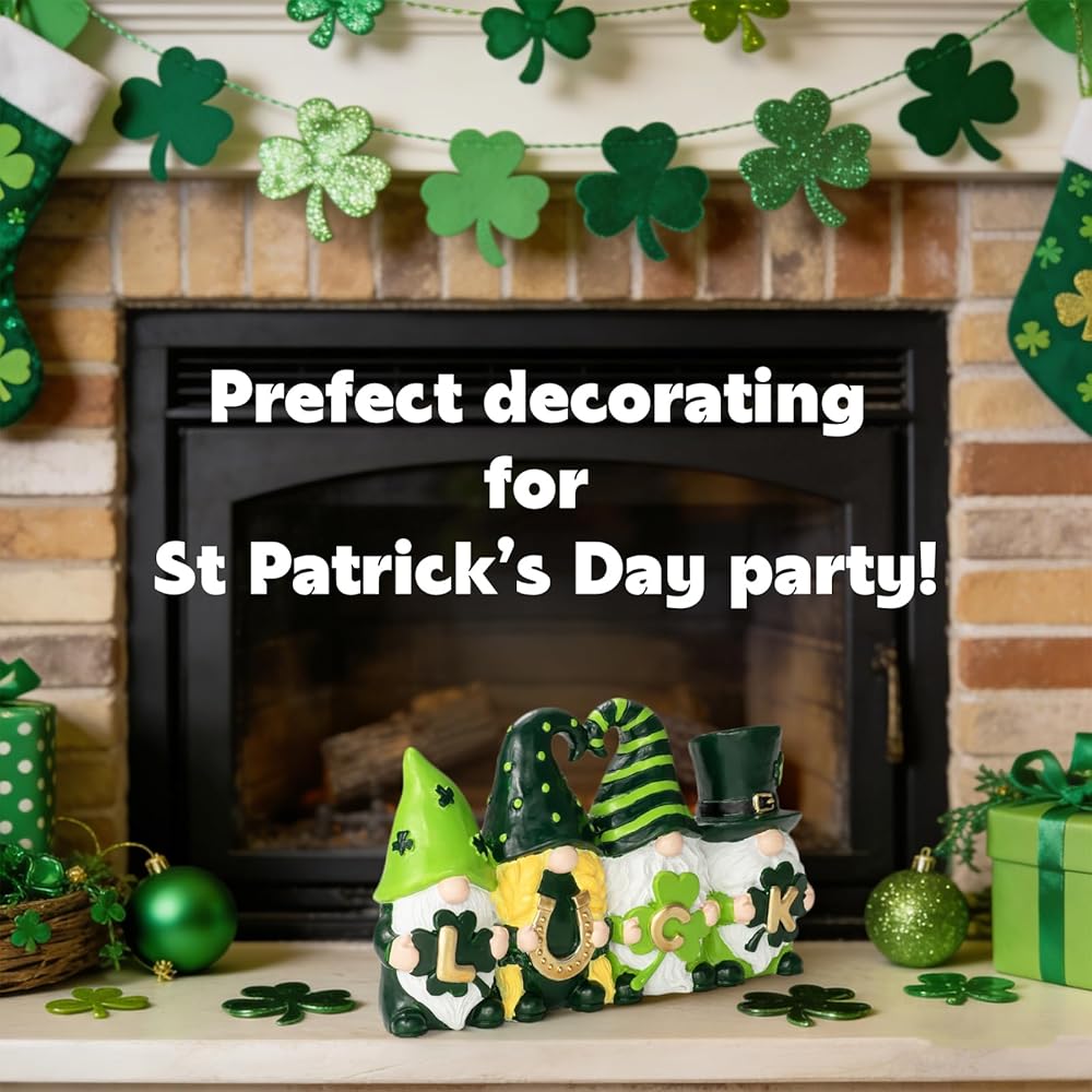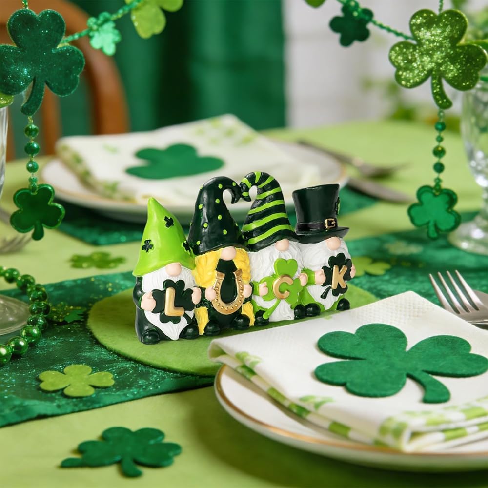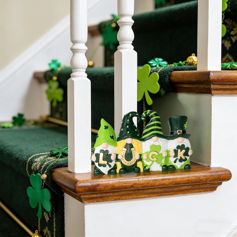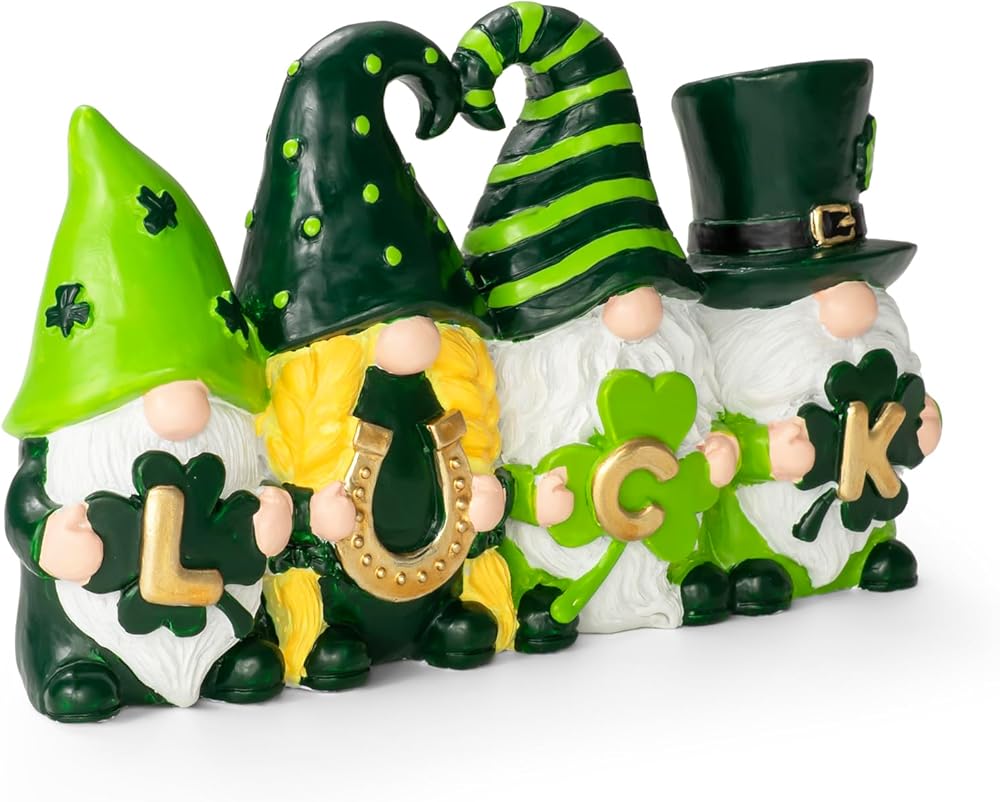 ديكور جنوم تحت عنوان عيد القديس باتريك: احتفل بحظ الأيرلنديين مع مجموعة تماثيل عيد القديس باتريك الساحرة. إنها تتهجى "الحظ" مع أربعة أقزام رائعة، كل منها يرتدي ملابس خضراء احتفالية وقبعات فريدة من نوعها.