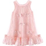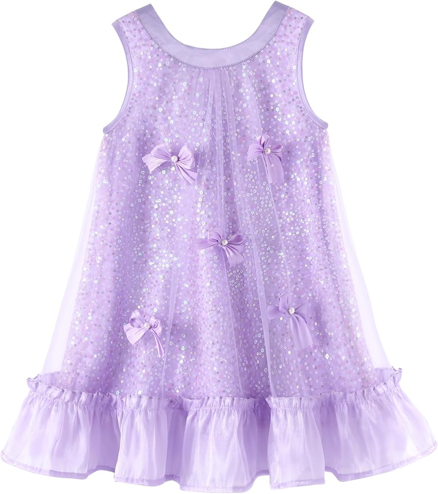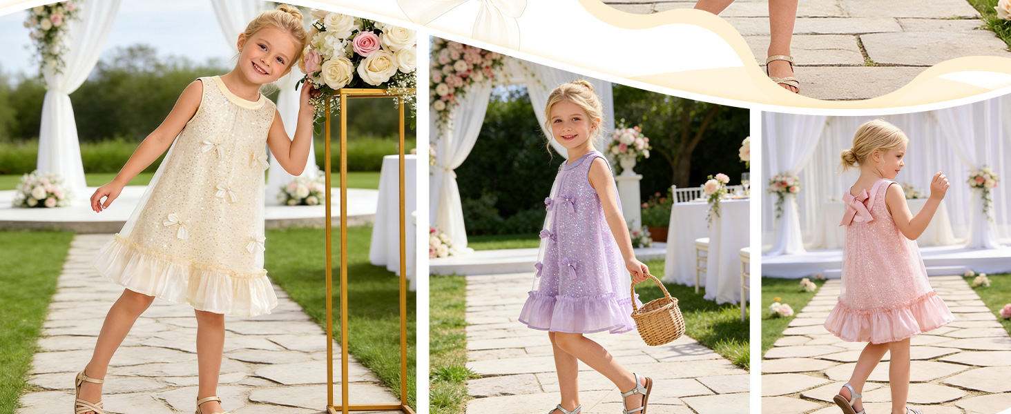 • تصميم فريد: يتميز فستان الفتيات هذا بتصميم كلاسيكي على شكل حرف A، وتصميم بدون أكمام، ورقبة دائرية. إنها مزينة بشبكة وترتر وأقواس، وتضيف التنورة الساتان اللامعة لمسة من الرقي، مما يجعل طفلك الصغير أكثر مرحًا وجذابًا.