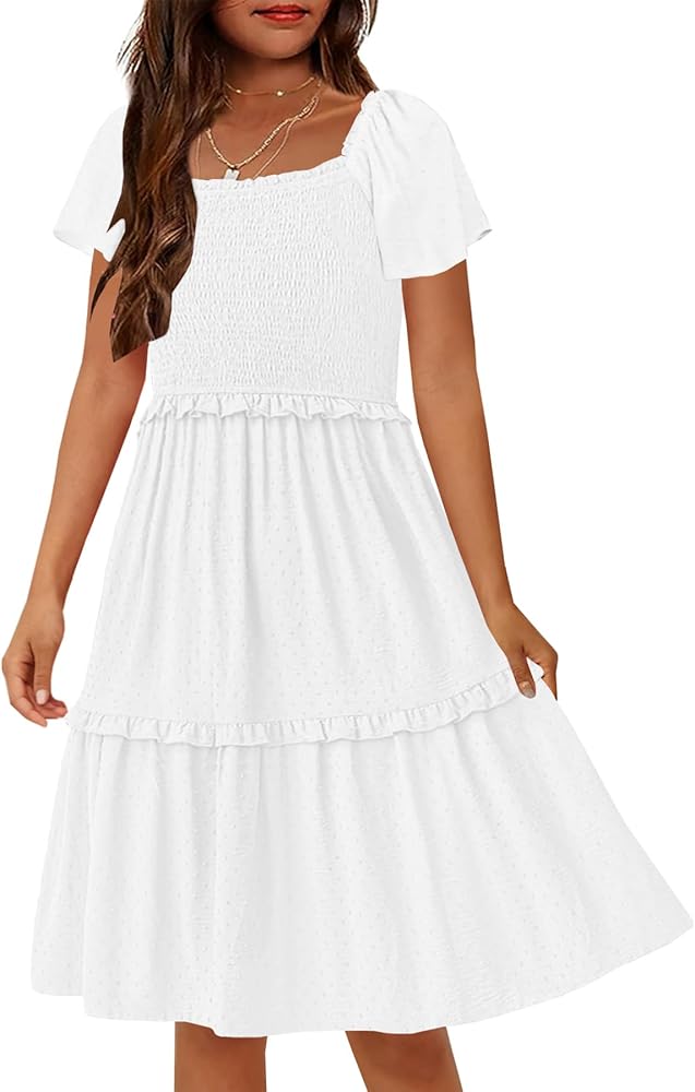 المزايا: لون كلاسيكي ثابت، كم قصير مكشكش، رقبة مربعة، خصر مرن، حاشية مكشكشة، خط على شكل حرف A، فستان متوسط الطول متأرجح مع جيبين جانبيين، جذاب جدًا وجميل