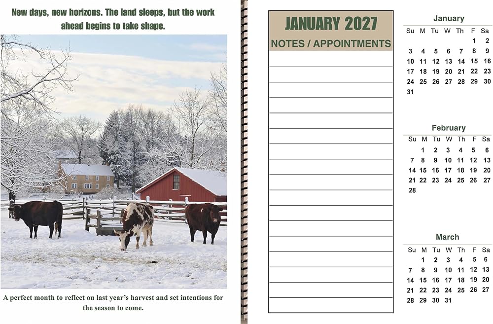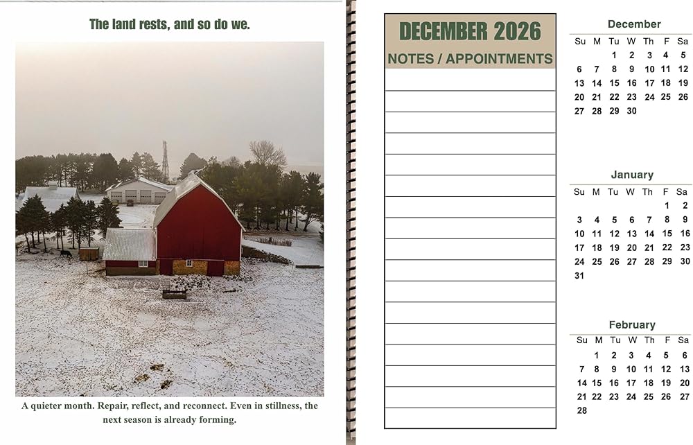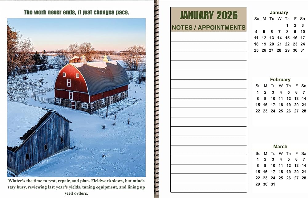Farmer's Desktop Calendar – Large Print Edition January 2026 to January 2027 | 11" × 8.5" closed / 17" × 11" open Honor tradition. Celebrate the seasons. Stay organized. Rooted in Heartland spirit, this calendar blends practical planning with everyday beauty—perfect for farmers, families, neighbors, and anyone who loves Country living. Designed for clarity, durability, and functionality, it's a practical planning tool you'll reach for every day—at the kitchen table, in the shop, or on your desk.