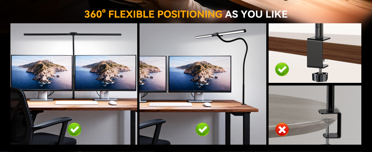 [تعديل مرن وتصميم للعناية بالعين]: يتميز الضوء الحرفي المشبك بذراع متأرجح مرن يمكن أن يدور 360 درجة ويقلب لأعلى ولأسفل 180 درجة، إلى جانب رؤوس مصباح مزدوجة 270 درجة لتوفير زوايا إضاءة متعددة، مناسب للطاولات ذات الشاشات المزدوجة؛ يوفر إضاءة خالية من الوميض ومضادة للوهج مع ≥95 CRI استثنائي، يحاكي هذا المصباح ضوء الشمس الطبيعي لتقليل إجهاد العين أثناء استخدام الكمبيوتر لفترة طويلة، وهو مثالي لصياغة الطاولات ومقاعد العمل وإعدادات الشاشة