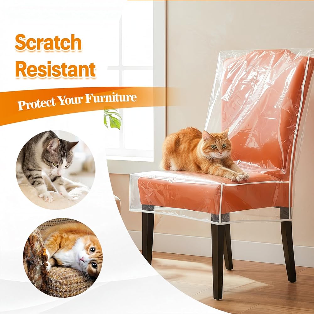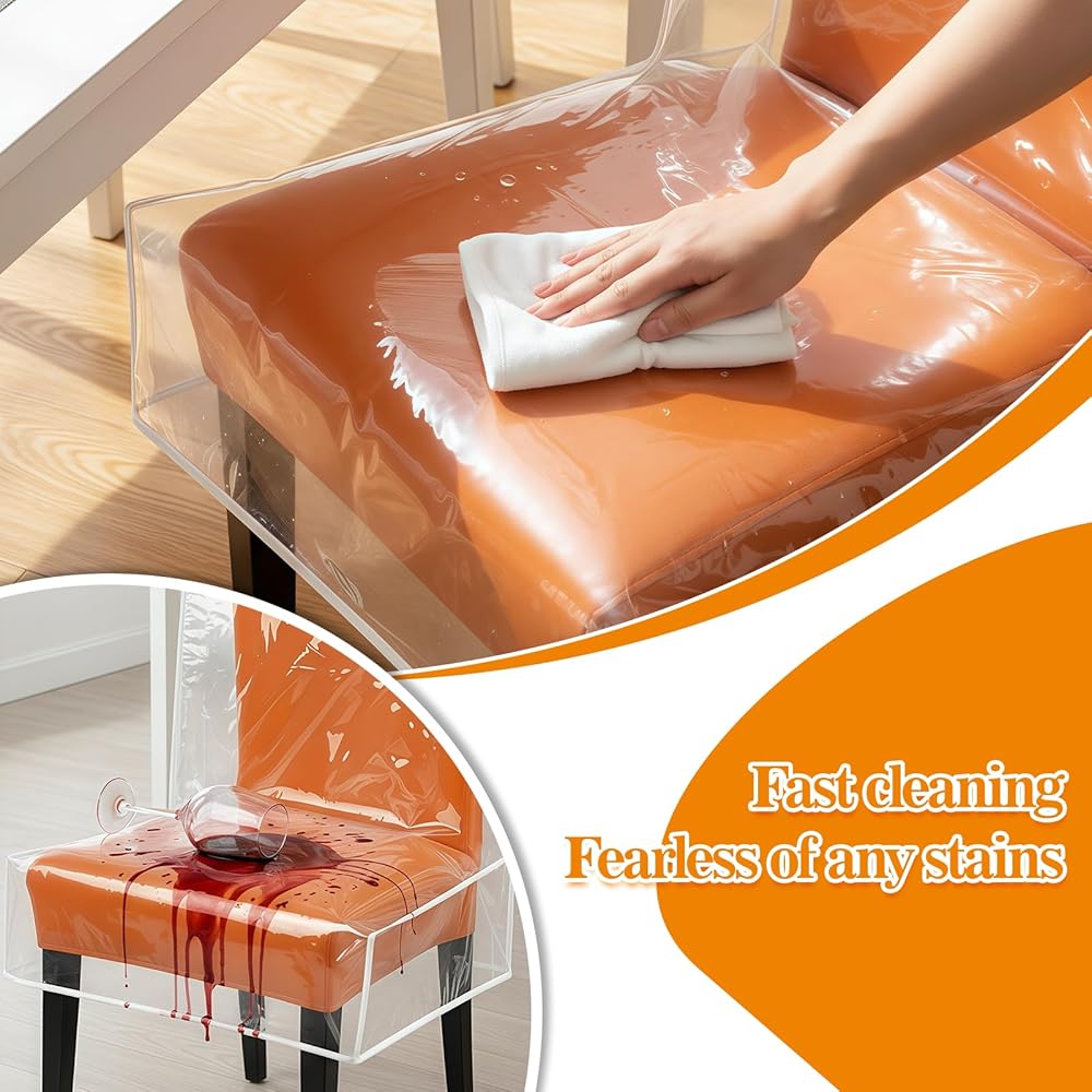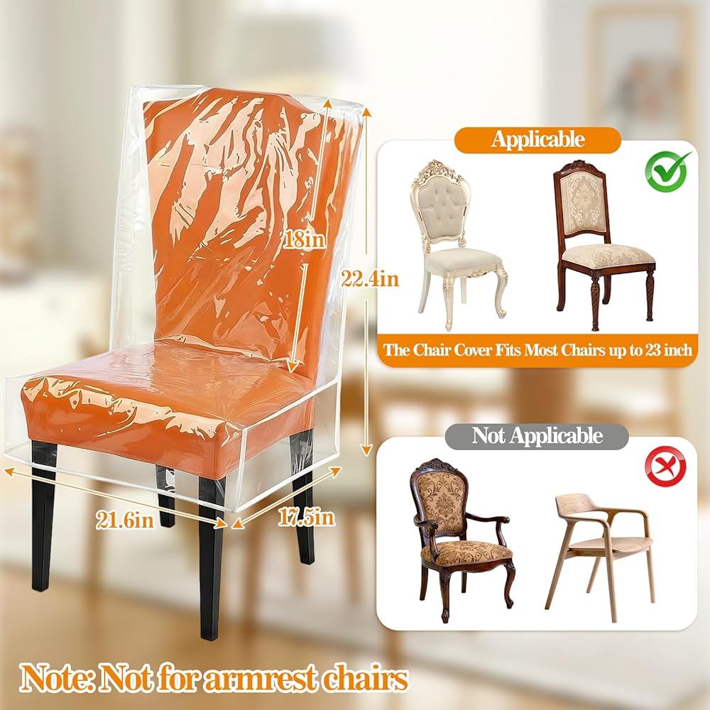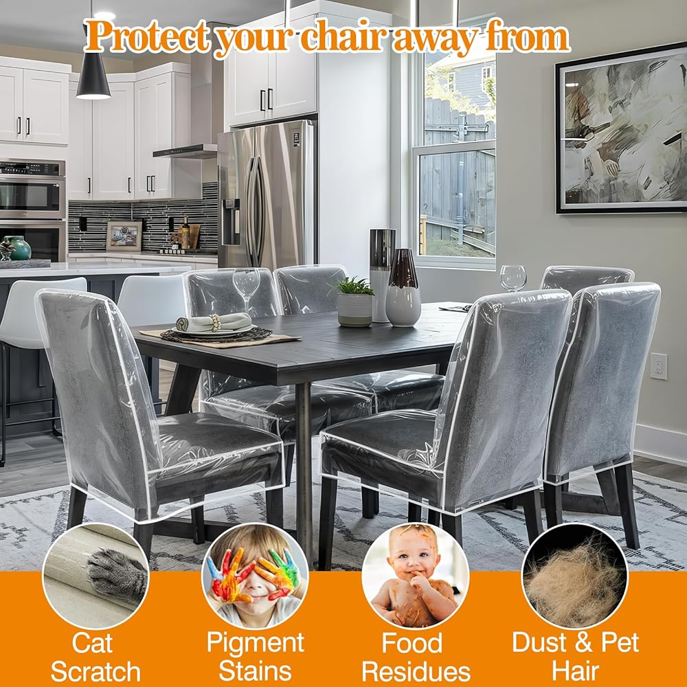 • Full-Cover Protection: This clear dining chair covers features a full backrest to protect the entire chair, not just the seat. Effectively shields against spills, dust, pet fur, claw scratches, and kids' messes—keeping your dining room chair covers looking brand new.​