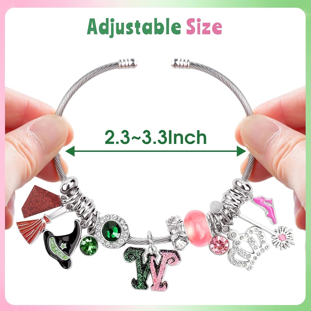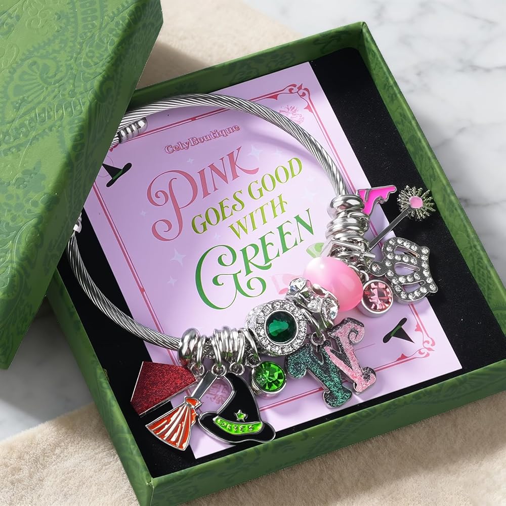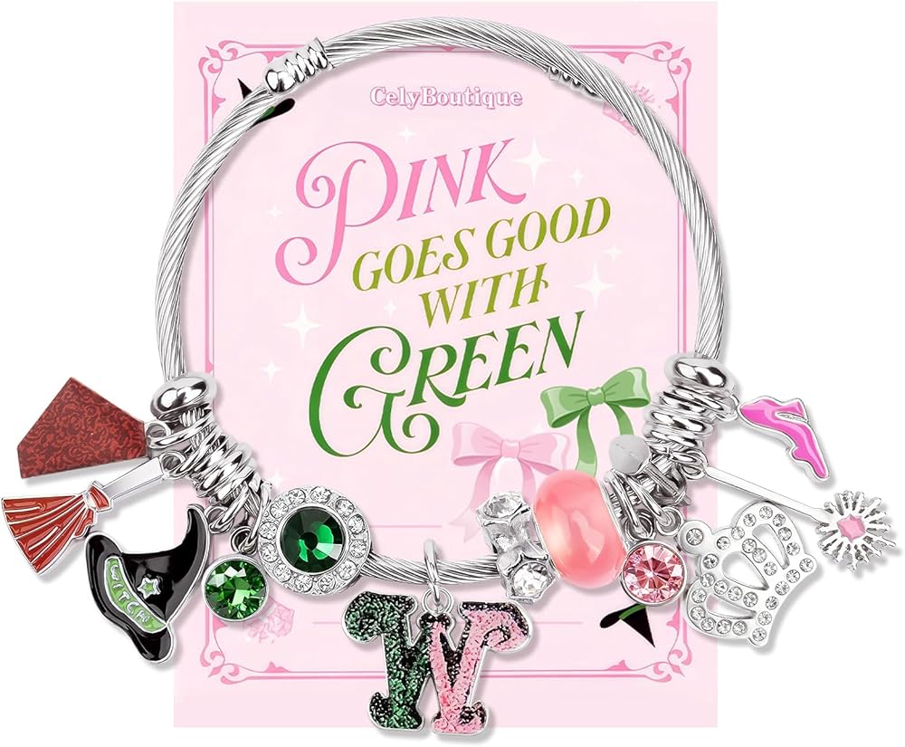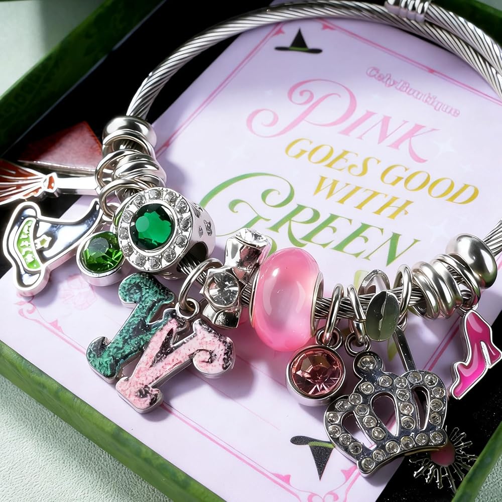 This enchanting pink and green charm bracelet from CelyBoutique brings a touch of whimsy and magic to any outfit. Featuring a delightful princess theme, this bracelet showcases an array of sparkling charms including a witch's hat with green crystals, a broomstick, a glamorous crown adorned with clear rhinestones, and a commemorative emblem with pink and green glitter details. The centerpiece includes a stunning green talisman surrounded by shimmering crystals, complemented by a princess pink luck bead that adds a soft, feminine touch. Additional charms feature pink flamingos, flowers, and decorative elements that create a playful yet sophisticated look. The adjustable cable bracelet fits wrists from 2.3 to 3.3 inches in diameter, making it suitable for various wrist sizes. The flexible design ensures comfortable wear throughout the day while the durable construction keeps your charms secure. Perfect for those who appreciate unique jewelry that tells a story, this charm bracelet makes an excellent gift for birthdays, holidays, or any special occasion. The pink and green color combination is both trendy and timeless, proving that pink truly does go good with green.