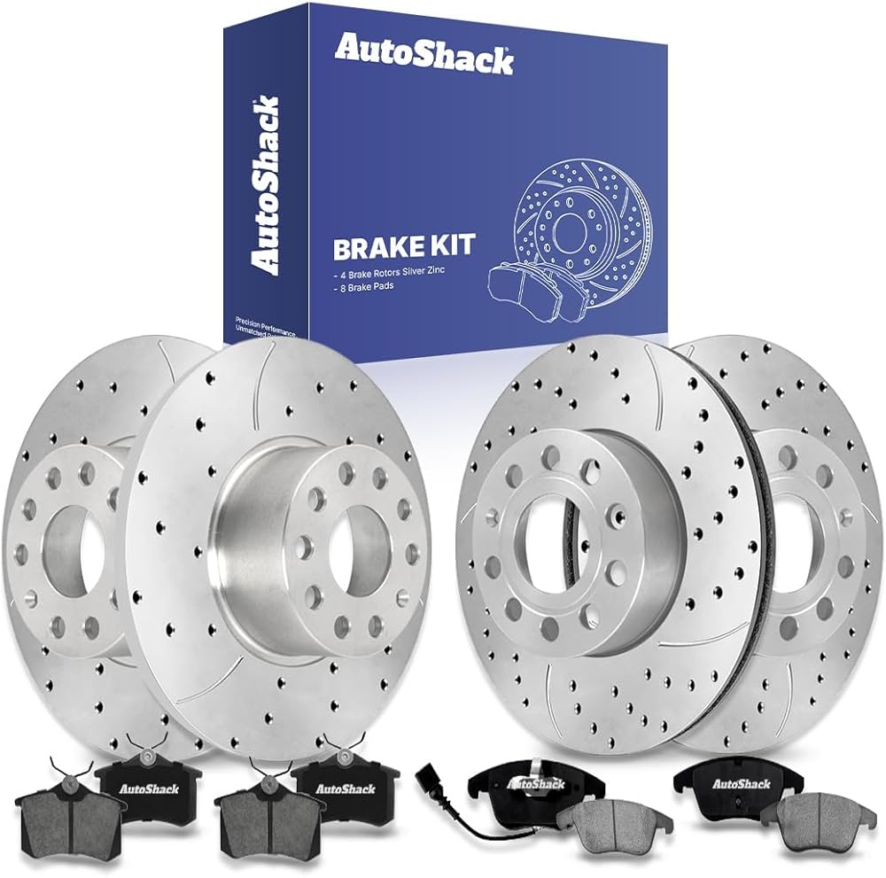 دوارات الفرامل المطلية بالزنك الفضية ذات فتحات تهوية أمامية وخلفية من AutoShack + وسادات سيراميك بديلة لمجموعة فرامل 12 قطعة لـ 2012-2018 Volkswagen Jetta 2011-2013 Audi A3 SilverShield Pro