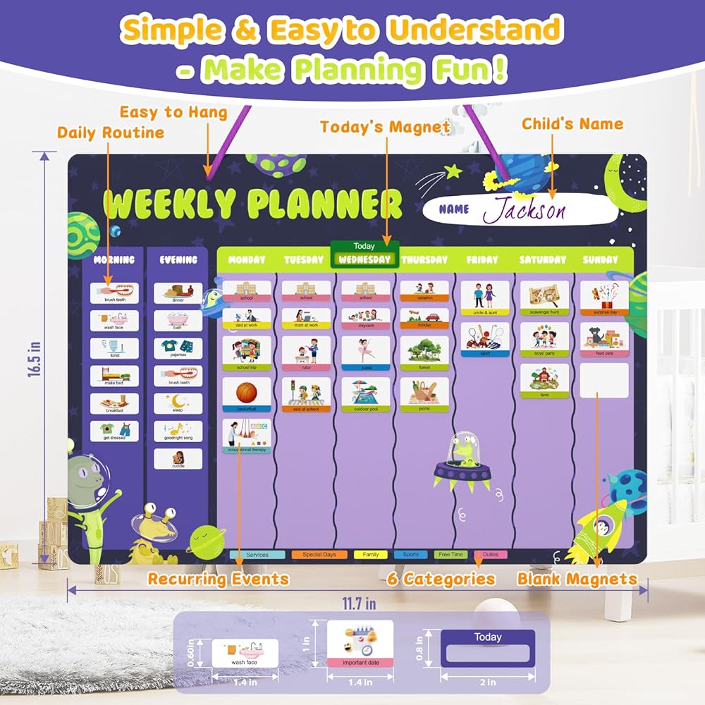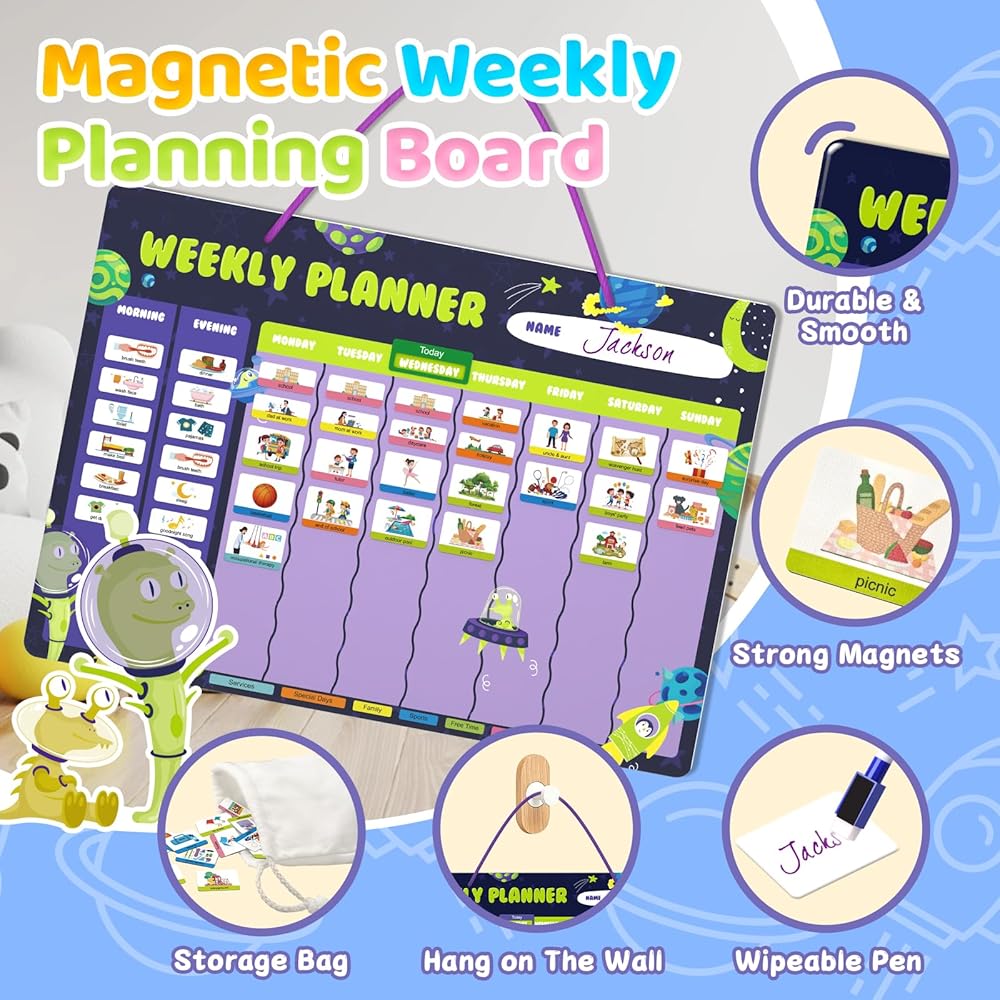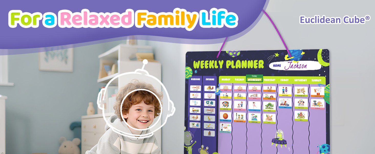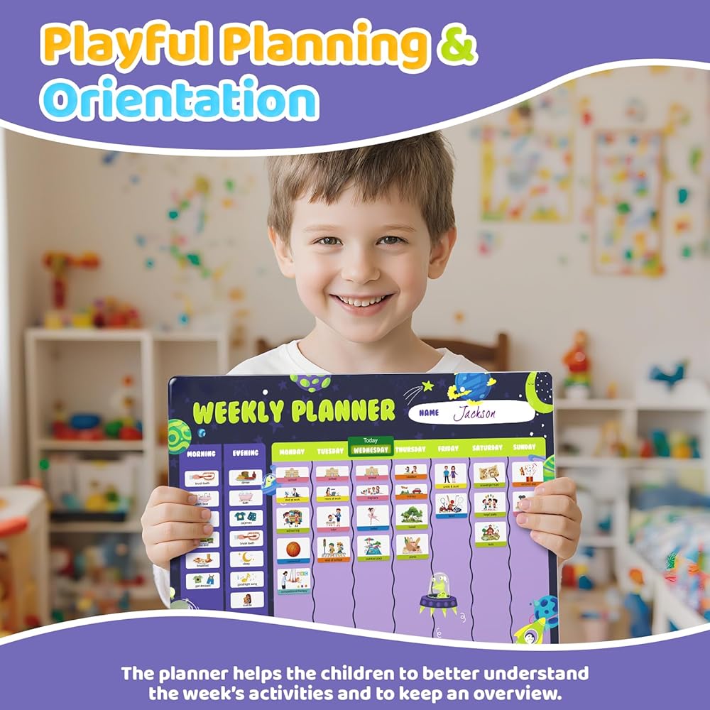 التخطيط والتوجيه المرح: مزيج من روتين الصباح/المساء + مخطط أسبوعي مع موضوع مساحة لطيف وألوان ممتعة، مما جعله مرئيًا وحوّل التخطيط أيضًا إلى تجربة ممتعة. إنه تقويم رائع للأطفال لأنه يشجع التنظيم والتفاعل.