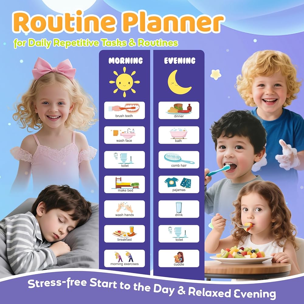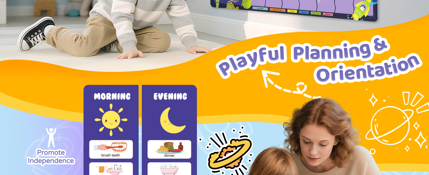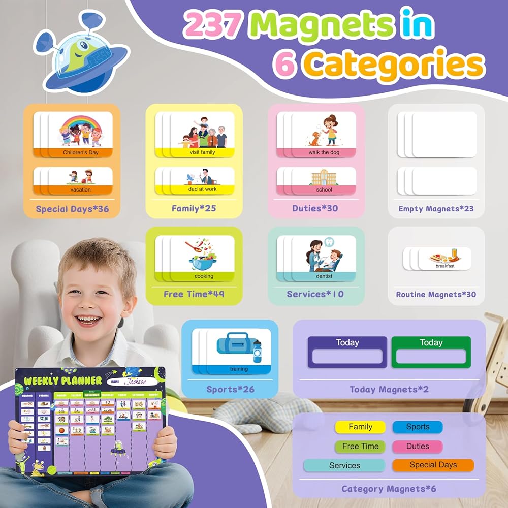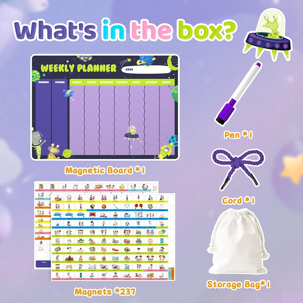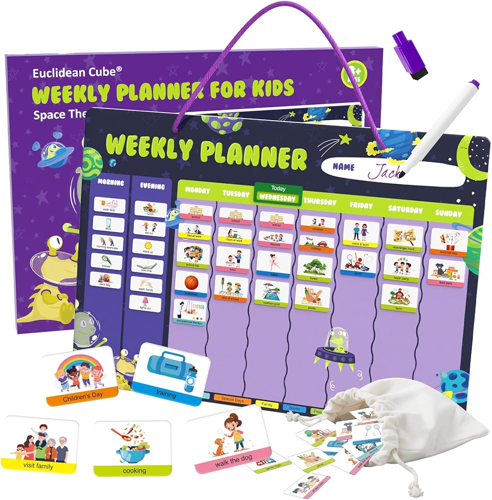 التخطيط والتوجيه المرح: مزيج من روتين الصباح/المساء + مخطط أسبوعي مع موضوع مساحة لطيف وألوان ممتعة، مما جعله مرئيًا وحوّل التخطيط أيضًا إلى تجربة ممتعة. إنه تقويم رائع للأطفال لأنه يشجع التنظيم والتفاعل.