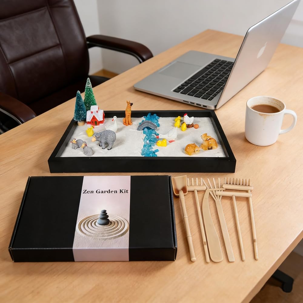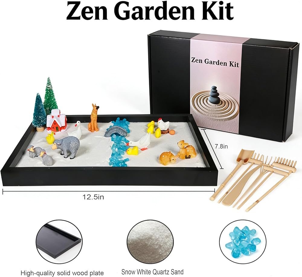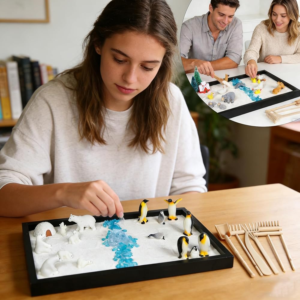 • verything you need is included: 1 wooden sand tray, 1 lbs of white sand, 8pcs polar bear kits, 9pcs penguin kits, 21pcs farm detailed miniatures, 6 rakes/tools, 1 pack of blue small stones—unbox and start your mindfulness journey instantly.