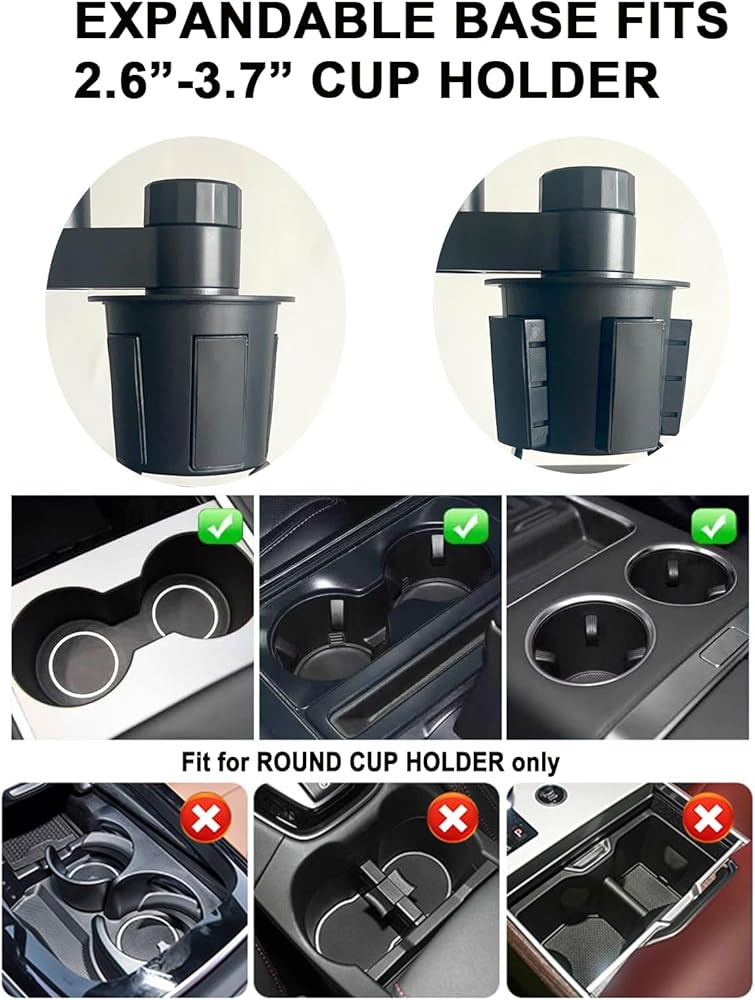 Round hloder compatibility: The expandable cup holder base fits round OEM cup holders (2.56"-3.7" diameter wide) . Please verify your vehicle's model and check product size(Round holder 2.56"-3.7"DM) against your original cup holder before ordering . Or you can tell us your: Vehicle year and model, photo of cup holder inner diameter, and customer service assistance for a better user experience.