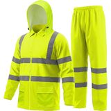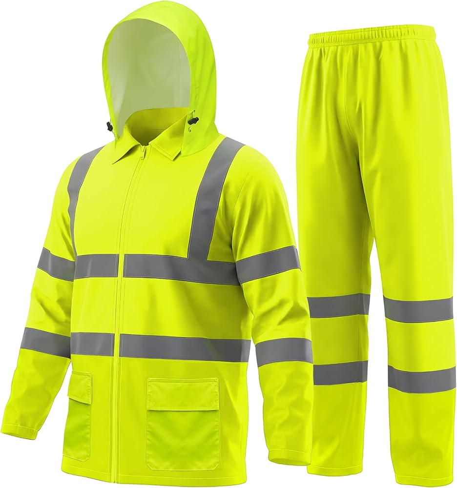 معدات مطر عالية الوضوح - كن مرئيًا وابق آمنًا مع مادة خضراء نيون عالية الوضوح وشريط عاكس يلبي معايير ANSI 107-2020 والفئة 3، مما يضمن الرؤية في البيئات منخفضة الإضاءة أو الممطرة.